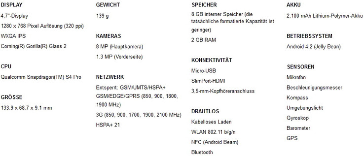 Das Smartphone Nexus 4 (133,9 x 68,7 x 9,1 mm) wird mit 4,7 Zoll IPS-Plus-Panel (1.280 x 768 Pixel), Qualcomm Snapdragon S4 Pro Quad-Core-SoC der Generation "Krait" mit 1,5 GHz, 2 GByte RAM und 8 oder 16 GByte Speicher für 299 respektive 349 Euro angeboten. Weiterhin an Bord des 139 Gramm schweren Smartphones: Android 4.2 Jelly Bean, Kameras mit 8,0 MP an der Rückseite und 1,3 MP auf der Vorderseite, ein Akku mit 2.100 mAh (Li-Polymer) und NFC.