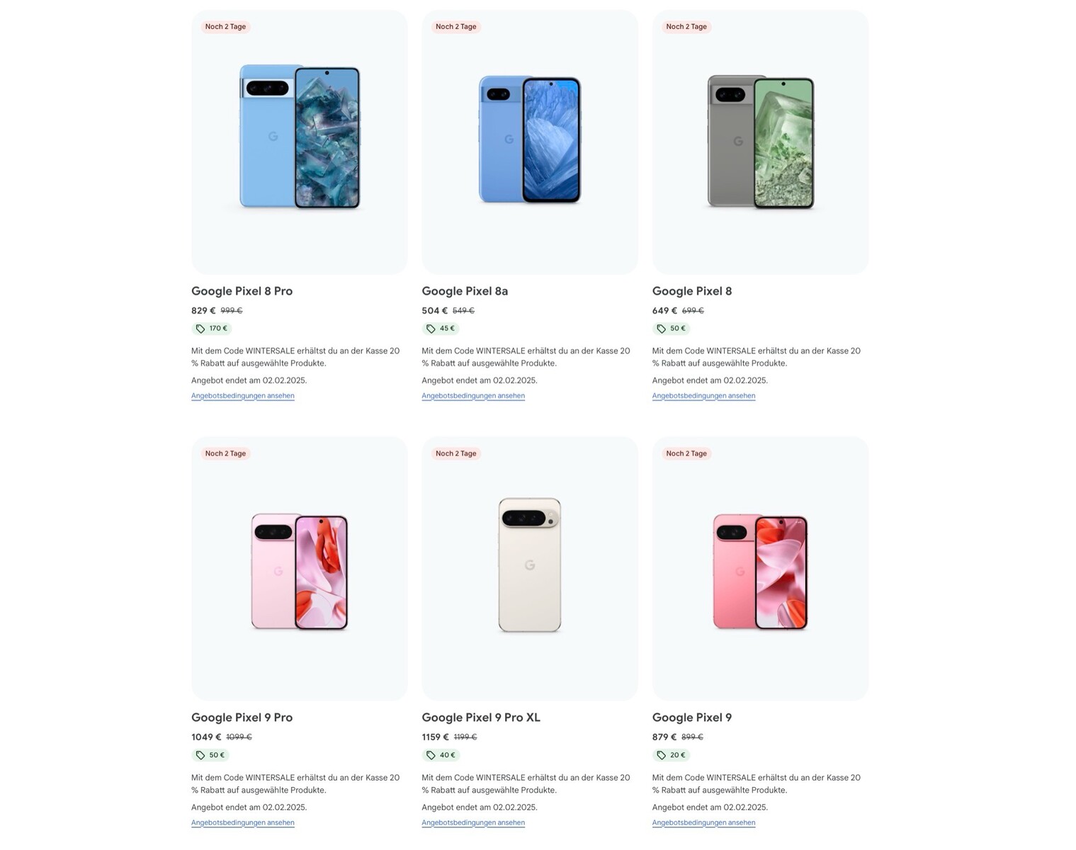 Im Google Store läuft ab sofort bis zum 2. Februar ein Winter Sale, eine Rabattaktion, bei der Kunden mit dem Code "WINTERSALE" 20 Prozent auf teilweise bereits rabattierte Preise sparen können. Einige der interessanteren Angebote, wie das Pixel 8a für 403 Euro, sind bereits vergriffen, allerdings sind nach wie vor Rabatte auf Pixel-Smartphones, Tablets und Smart-Home-Produkte zu bekommen.