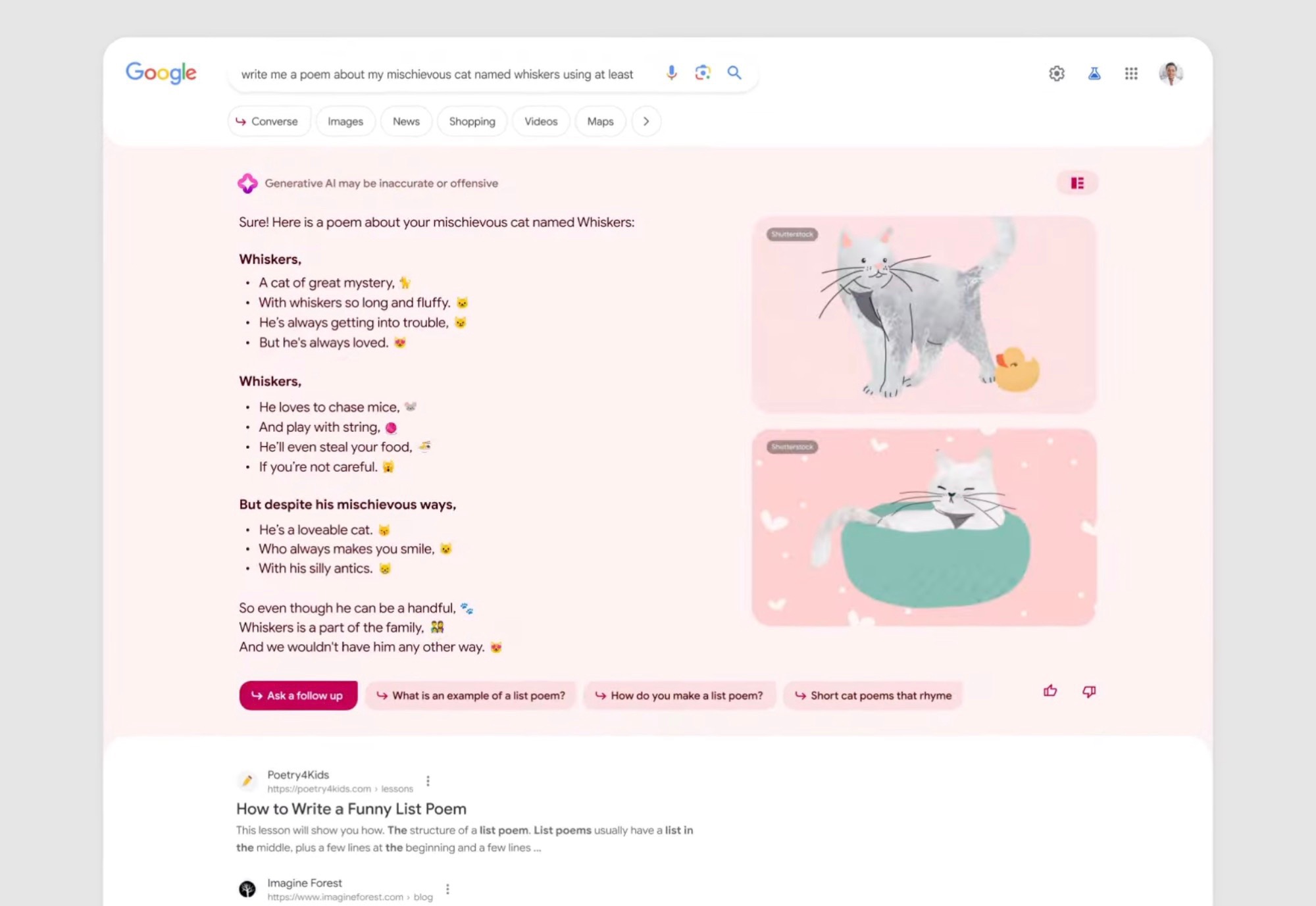 Ähnlich wie Bing auf ChatGPT-Basis generiert die neue Google Suche Antworten durch eine künstliche Intelligenz, sodass viele Fragen direkt auf Google beantwortet werden können, ohne dass Nutzer dazu erst auf Links klicken müssen. Der Großteil des Bildschirms wird von dieser KI-Antwort eingenommen – wer Suchergebnisse sehen möchte, muss durch die KI-Antwort scrollen. Google nennt diesen Bereich einen "AI Snapshot". Ein dezenter Button auf der rechten Seite des Snapshots blendet Links zu den Quellen ein, die Google verwendet hat, um die Antwort zu erstellen.