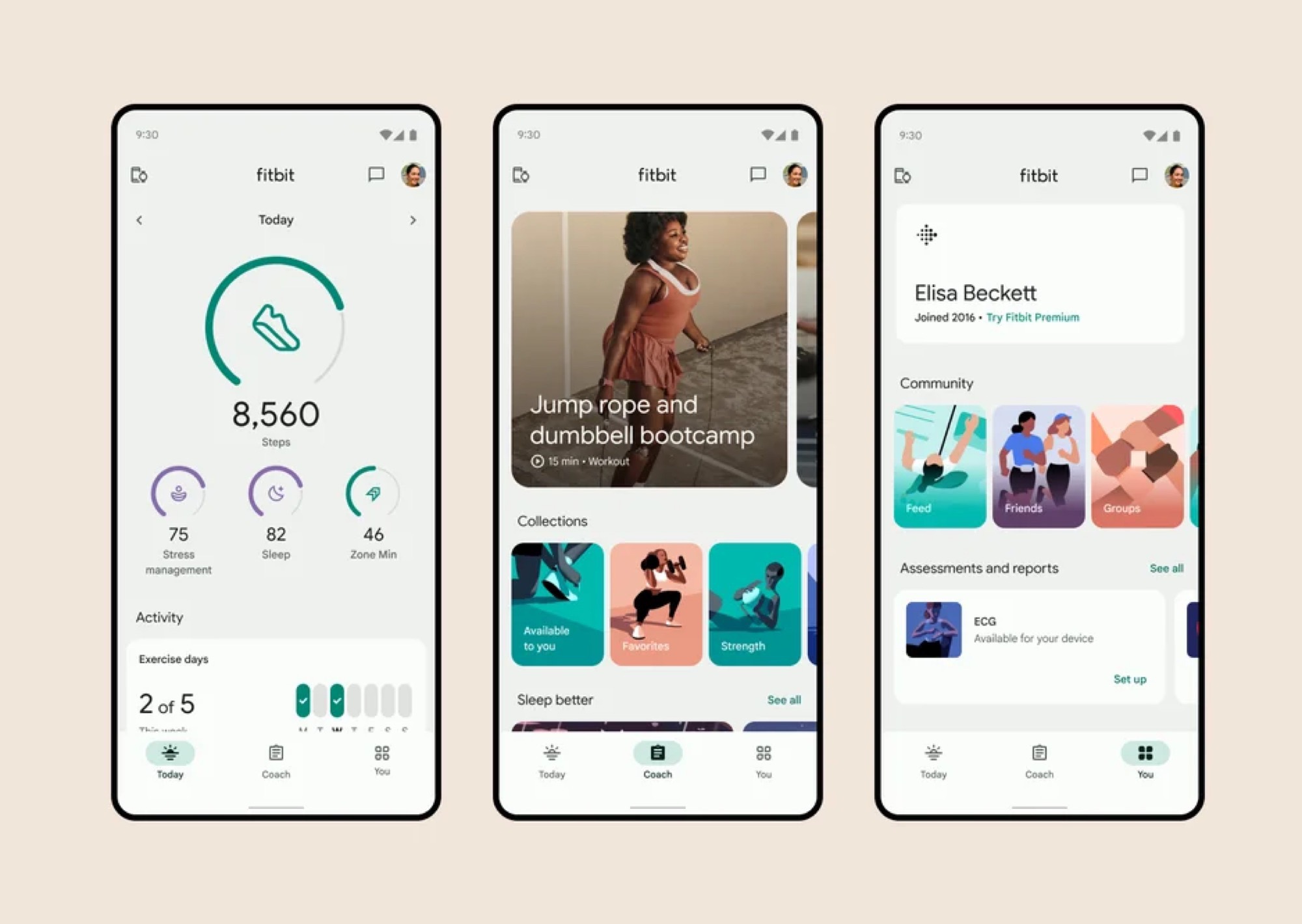 Die neue App wird in drei Bereiche aufgeteilt: Today, Coach und You. Im Today-Tab werden die wichtigsten Daten des laufenden Tages gesammelt dargestellt, sodass Nutzer auf einen Blick sehen können, wie viel Sport sie heute bereits getrieben haben, wie lange und tief sie geschlafen haben, und wie sich Metriken wie die Herzfrequenz oder die Blutsauerstoff-Sättigung im Verlauf des Tages entwickelt haben. Nutzer können anpassen, welche Daten in diesem Bereich dargestellt werden.