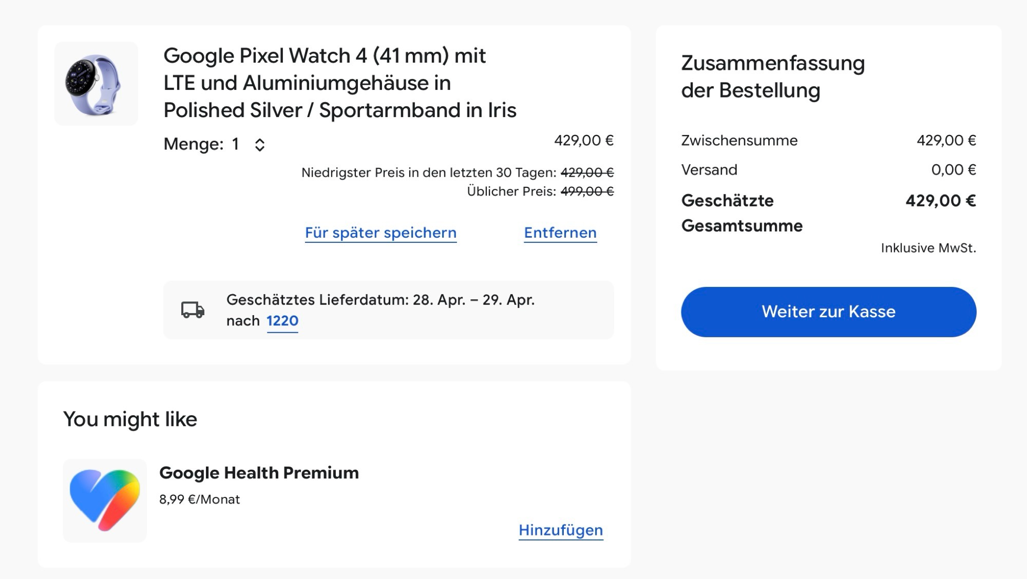 Denn wer derzeit im Google Online Store eine Pixel Watch 4 in den Warenkorb legt, bekommt dieses neue "Google Health Premium"-Abonnement direkt vorgeschlagen, und zwar zum Preis von 8,99 Euro pro Monat. Wie 9to5Google entdeckt hat, wird das Abo in der Fitbit-App bereits gelistet, wahlweise für 9,99 US-Dollar pro Monat oder für 99,99 US-Dollar pro Jahr. Das Jahresabo kostet damit 20 US-Dollar mehr im Vergleich zu Fitbit Premium. Derzeit ist noch nicht bekannt, ob Google Health Premium als Ergänzung oder als Ersatz für Fitbit Premium bestimmt ist.