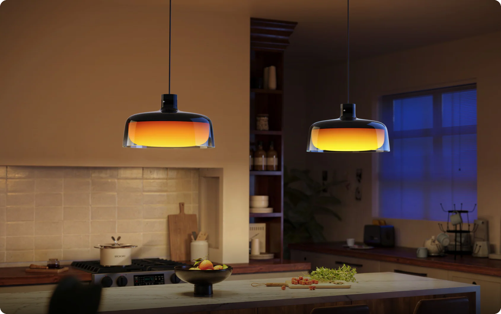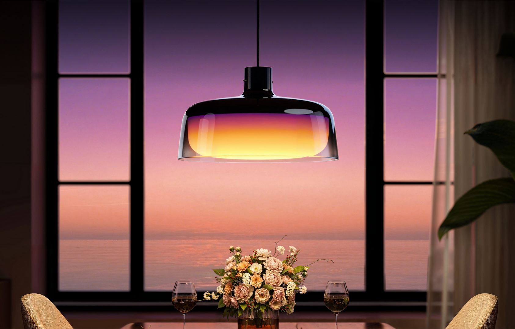 Die Hängelampe leuchtet auf Wunsch in bis zu drei verschiedenen Farben und hüllt so Räume in spektakuläre Lichtverläufe, wenn man dies möchte. Ausgewählt werden kann hierbei aus den üblichen rund 16 Millionen Farben. Natürlich kann sie aber auch ganz klassisch mit 2700K bis 6500K und 95 CRI für die Ausleuchtung des Esstisches ohne buntes Spektakel genutzt werden.