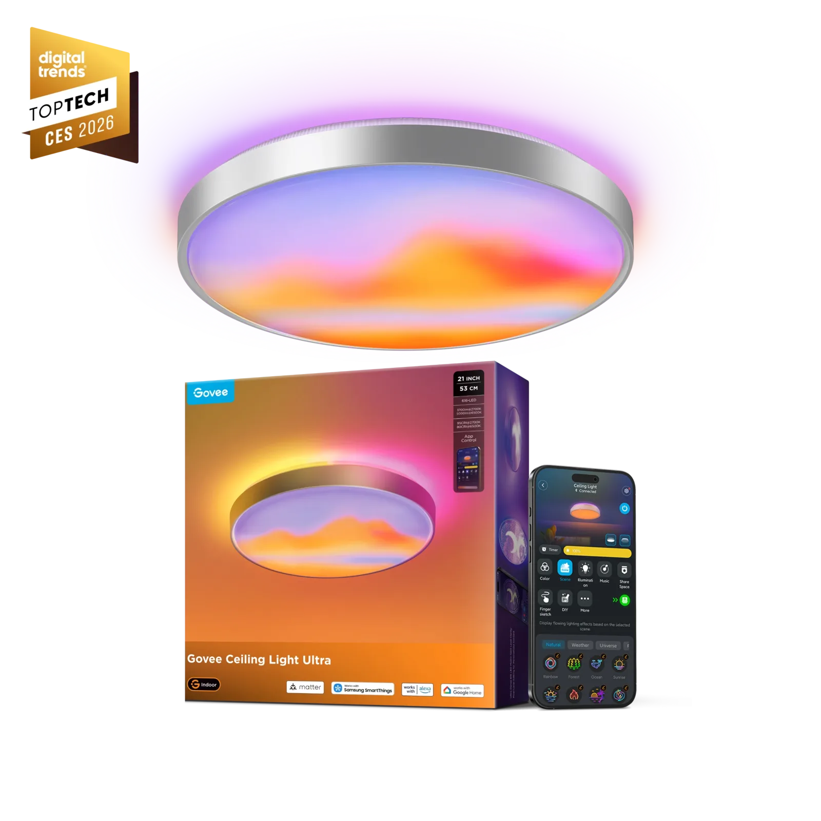 Alternativ kann die Govee 53 cm Smart Deckenleuchte Ultra natürlich auch ganz klassische einen Raum ausleuchten und soll hierbei laut Herstellerversprechen ein besonders natürliches Licht liefern, auch angepasst an den Tagesverlauf. Die Helligkeit beträgt bis zu 5.000 Lumen. Dazu bietet die neue smarte und 53 cm große Deckenleuchte Ultra von Govee die vom Hersteller bekannte Smart-Home-Vernetzung samt Matter sowie Sprachsteuerung über Amazon Alexa und Google Home.