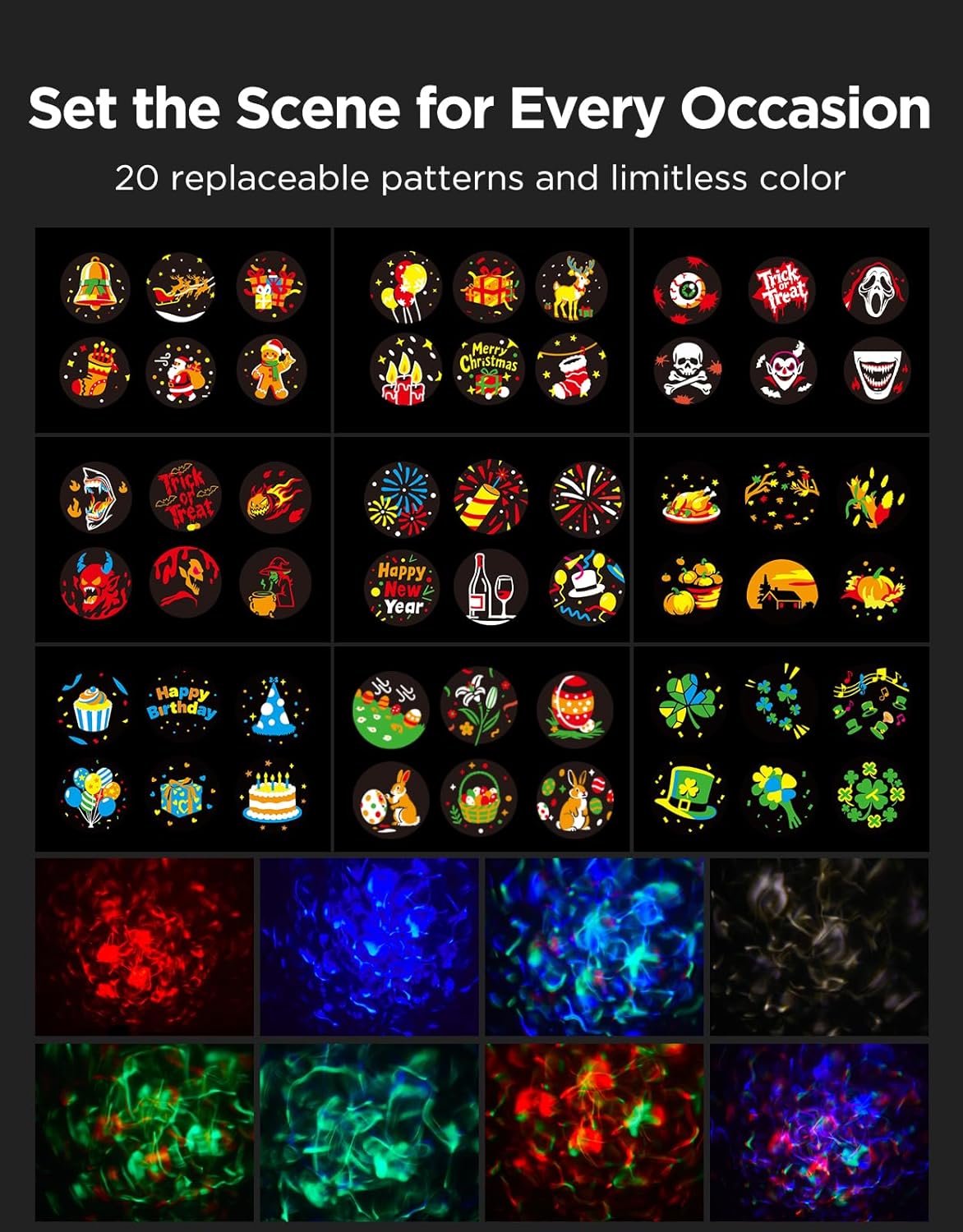 Das Projektorlicht für die Außendekoration wurde entwickelt, um gemusterte Lichteffekte auf die Außenwände von Häusern zu projizieren und eine Fläche von bis zu 156 m² zu beleuchten. Das Smart Light wird mit 20 Projektionsscheiben geliefert, die Themen wie Weihnachten, Halloween und Partys abdecken. Diese werden mit einer zweiten Lichtquelle kombiniert, die abstrakte, farbige Lichteffekte für den Hintergrund liefert. Mithilfe der Govee Home App können Nutzer die Beleuchtung anpassen. Dort finden sich auch voreingestellte Szenen, von denen einige mit Musik synchronisiert werden können.