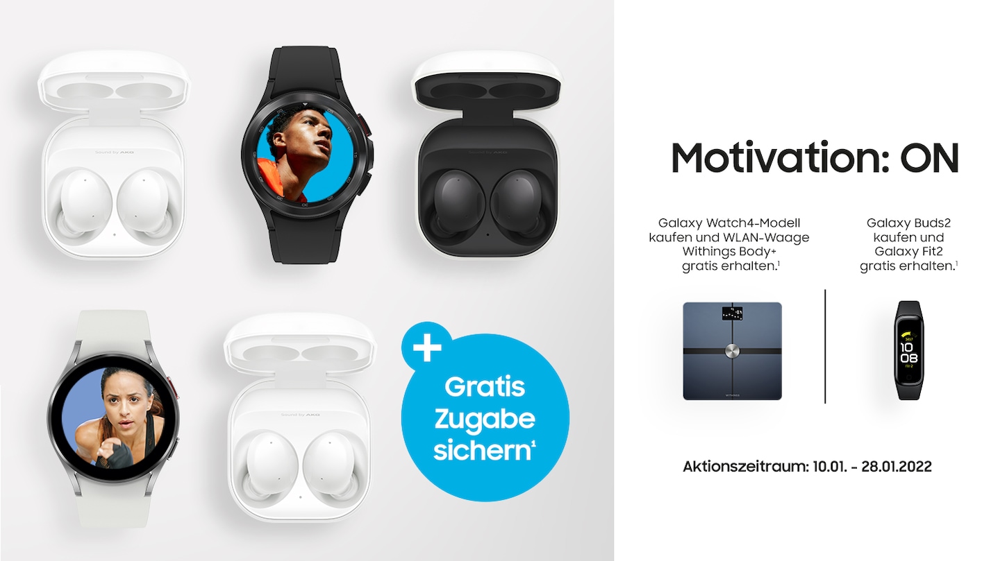 Samsung startet eine neue Aktion zum Jahresauftakt, um Kunden zum Kauf einer Galaxy Watch4 oder der Galaxy Buds2 zu bewegen. Unter dem Motto "Motivation: ON" gibt es Gratiszugaben für Käufer einer Smartwatch oder Ohrstöpsel von Samsung.