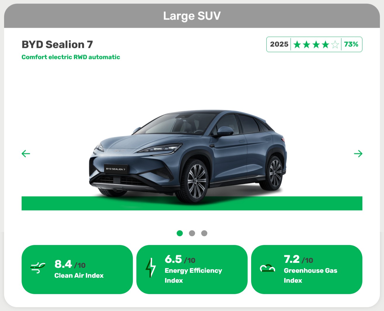 Bei den großen Elektro-SUVs holt sich der BYD Sealion 7 den Titel. Der Chinese kommt trotz seiner wuchtigen 82,6-kWh-Batterie auf vier Sterne (73 Prozent). Die Tester bescheinigen ihm eine klar bessere Umweltbilanz als vergleichbaren Verbrennern dieser Größe. Im Wintertest bei minus sieben Grad fiel zudem auf, dass die Heizung die Reichweitenverluste gut im Griff hat.