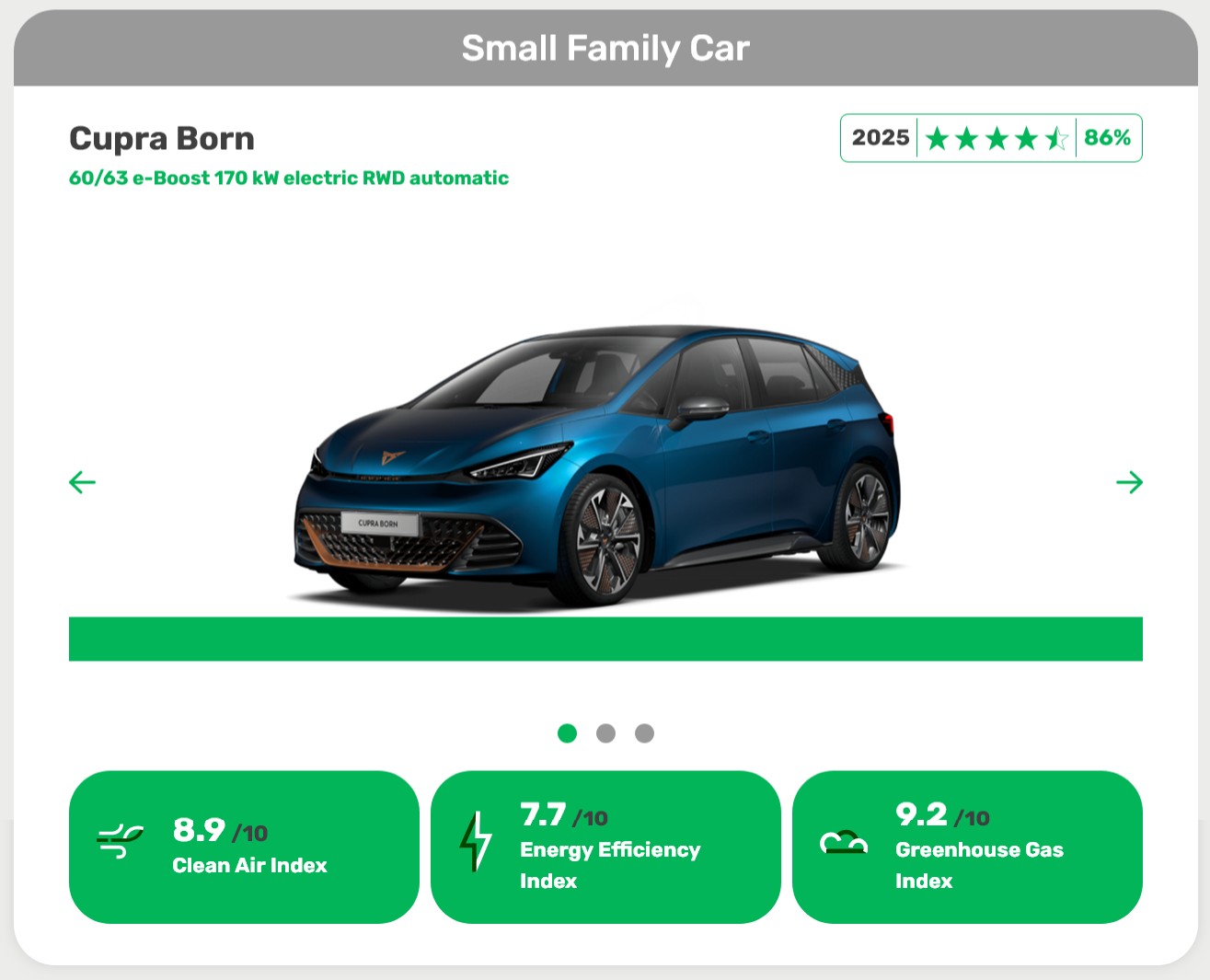 Der Cupra Born (60 kWh) gewinnt bei den kleinen Familienautos (4,5 Sterne, 86 Prozent). Doch die eigentliche Überraschung liefert der Seat Ibiza. Der Benziner kratzt mit 3,5 Sternen und 67 Prozent fast an der Vier-Sterne-Marke. Das ist für einen Verbrenner beachtlich und liegt am niedrigen Gewicht gepaart mit einer sehr sauberen Abgasreinigung.