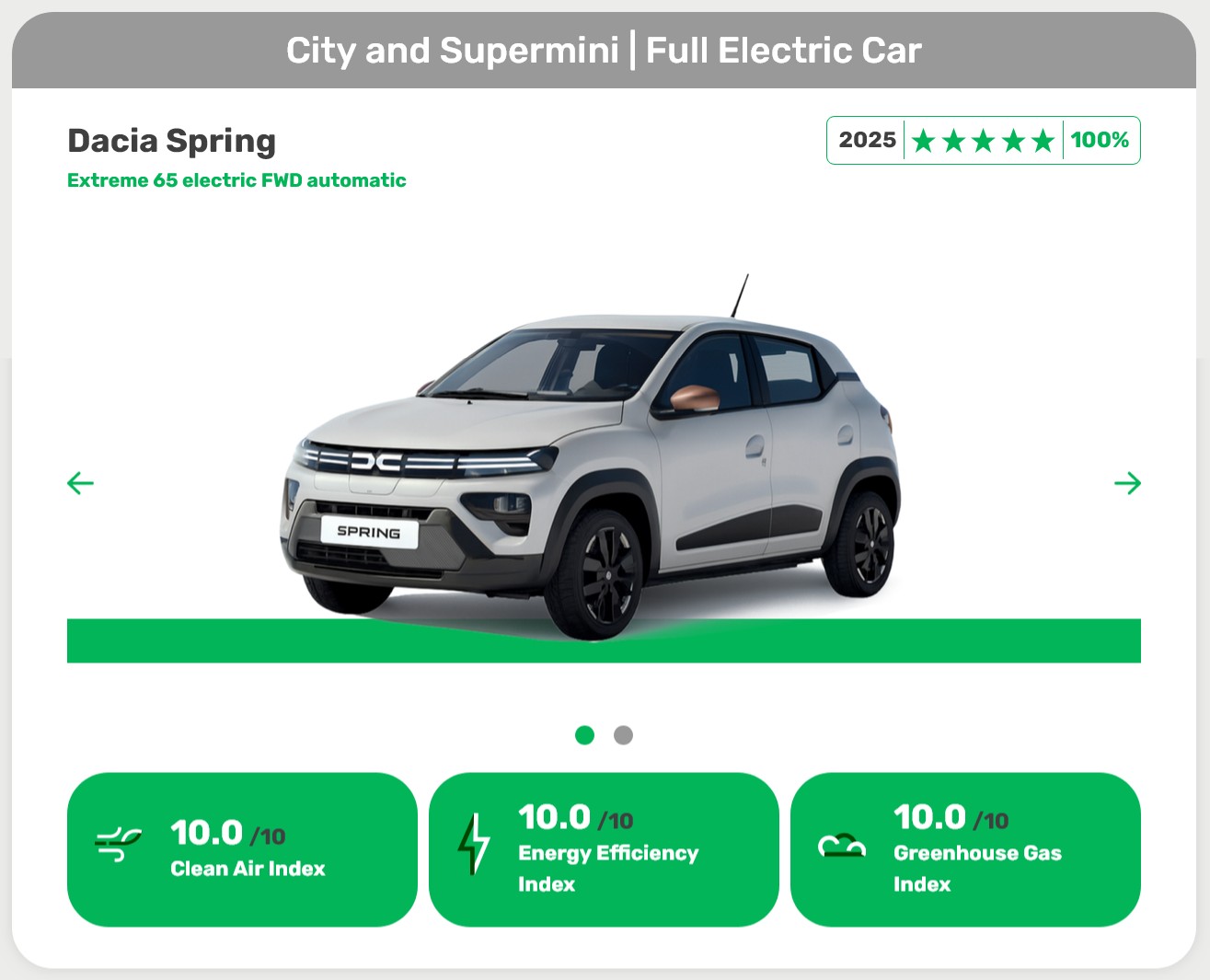 Bei den kleinsten Stromern fährt der Dacia Spring allen davon. Sein Erfolgsgeheimnis ist dabei eigentlich ein Verzicht: Weil die Batterie mit 27,6 kWh vergleichsweise winzig ist, stimmt die Ökobilanz perfekt. Das Ergebnis sind volle fünf Sterne und glatte 100 Prozent in der Gesamtwertung. Für die Experten von Green NCAP ist das nur logisch, denn weniger Gewicht und eine kleine Batterie sparen schon bei der Herstellung massiv Ressourcen.