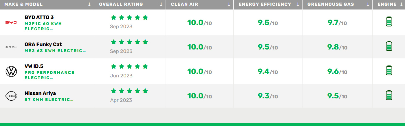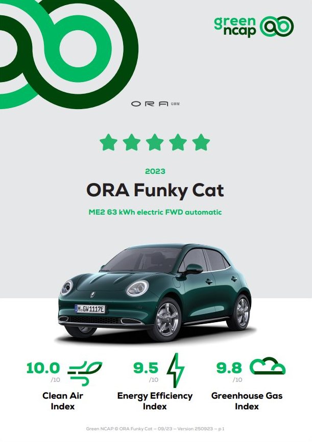 Der nicht minder ambitionierte chinesische Hersteller Great Wall Motors (GWM) produziert den ORA Funky Cat, der in den Green NCAP-Tests ein ähnlich gutes Ergebnis erzielte. Der ORA Funky Cat ist ein kompaktes Elektro-Fahrzeug für Familien mit vollelektrischem Antrieb, einer Leistung von 126 kW und einer Batteriekapazität von 63 kWh. Im Gegensatz zum Atto 3 liegt seine Grid-to-Battery-Ausgabe bei beeindruckenden 93,2 %, ein Wert, der bei Green NCAP-Tests bisher noch nicht erreicht wurde. Dies ermöglicht es dem Fahrzeug, seine Gesamtverbrauchswerte zu senken, so dass der ORA Funky Cat mit einer durchschnittlichen Bewertung von 97 % ebenfalls ganz locker 5 Green Stars erreicht.