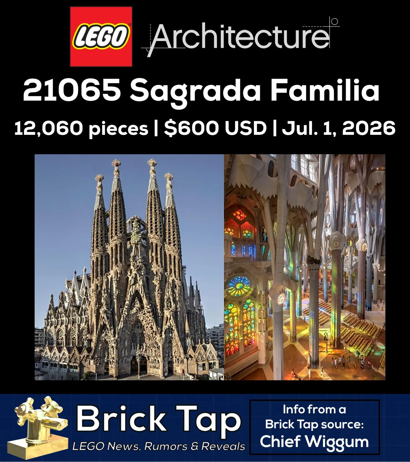 Basierend auf Informationen, die von „Chief Wiggum“ veröffentlicht und auf Plattformen wie Reddit und Instagram geteilt wurden, soll es sich um ein Set der Architecture-Reihe mit der Nummer 21065 handeln, das die Sagrada Família in Barcelona abbildet. Mit einer geplanten Höhe von 172 Metern ist das Original die höchste Kirche der Welt.