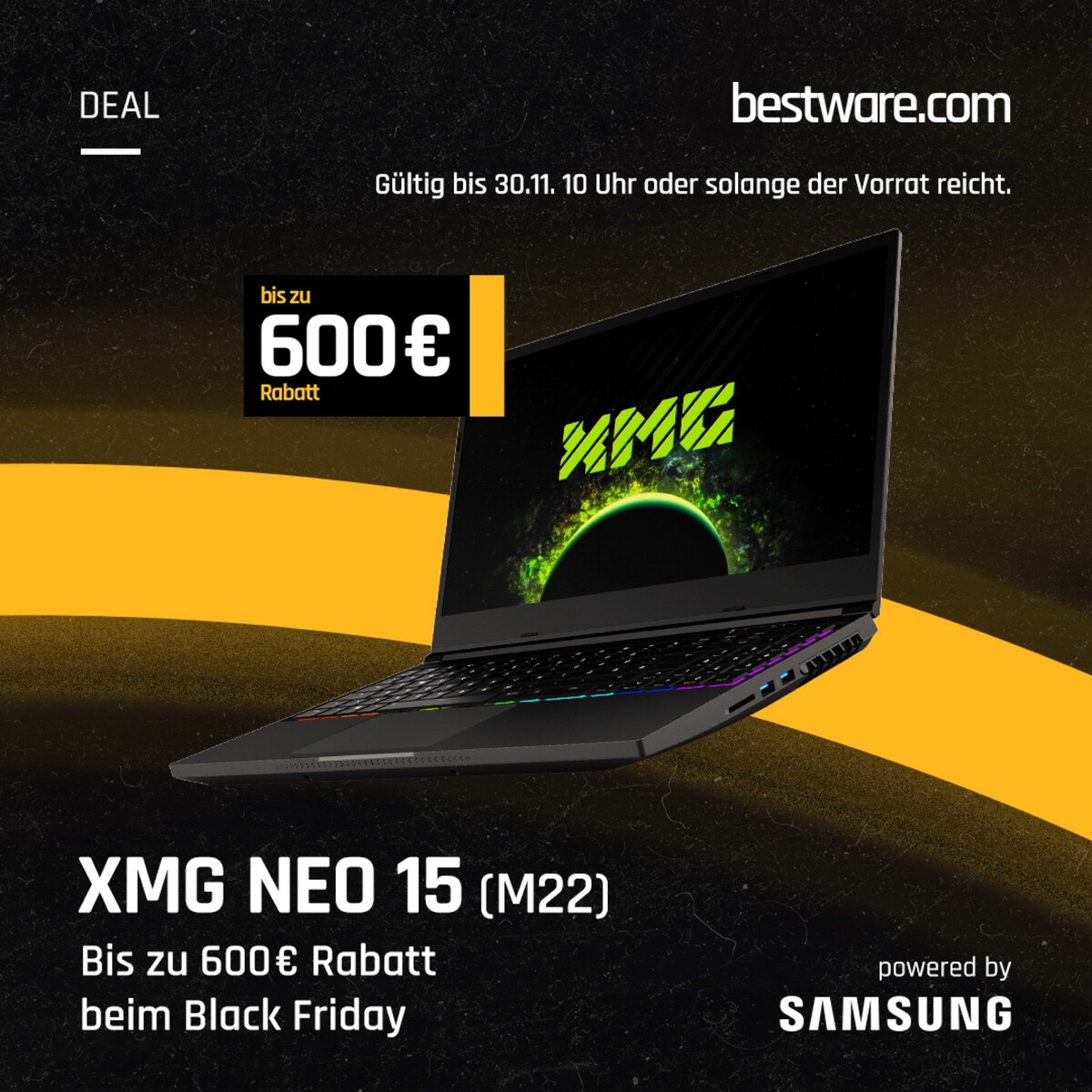 Der diesjährige Black Friday Sale auf Bestware läuft ab sofort bis zum 30. November um 10:00 Uhr, oder aber solange der Vorrat reicht. Dabei bietet XMG bis zu 600 Euro Rabatt auf ausgewählte Gaming-Laptops. Den größten Rabatt gibts beim XMG Core 15, das mit einem AMD Ryzen 7 6800H, einer Nvidia GeForce RTX 3060 Laptop-GPU, einem 144 Hz 1.080p-Display, 16 GB RAM und einer 500 GB SSD derzeit nur 1.099 Euro statt der üblichen 1.699 Euro kostet.