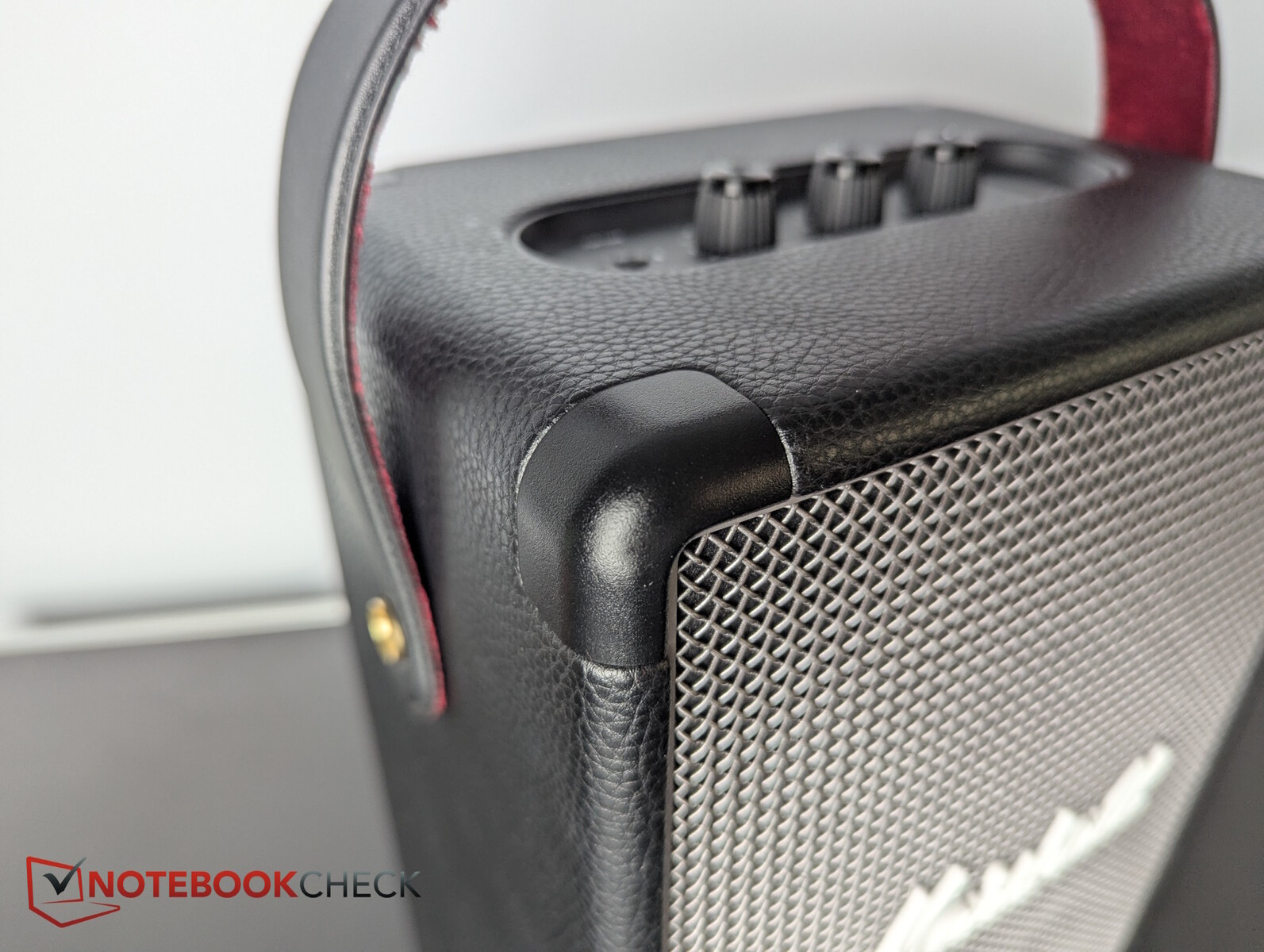 Der schwarze Tufton versprüht wieder Marshall-typischen Gitarren-Amp-Charme samt stylischem Design. Beim Tufton äußert sich das durch Lederimitat über allen Plastikoberflächen (außer der Rückseite), einem Metallgitter vorne, dem klassischen Marshall-Schriftzug darauf, Schutzkappen an allen Ecken, manuellem Drehregler auf der Oberseite sowie einem Leder-Tragegriff mit rotem Samt an der Innenseite.