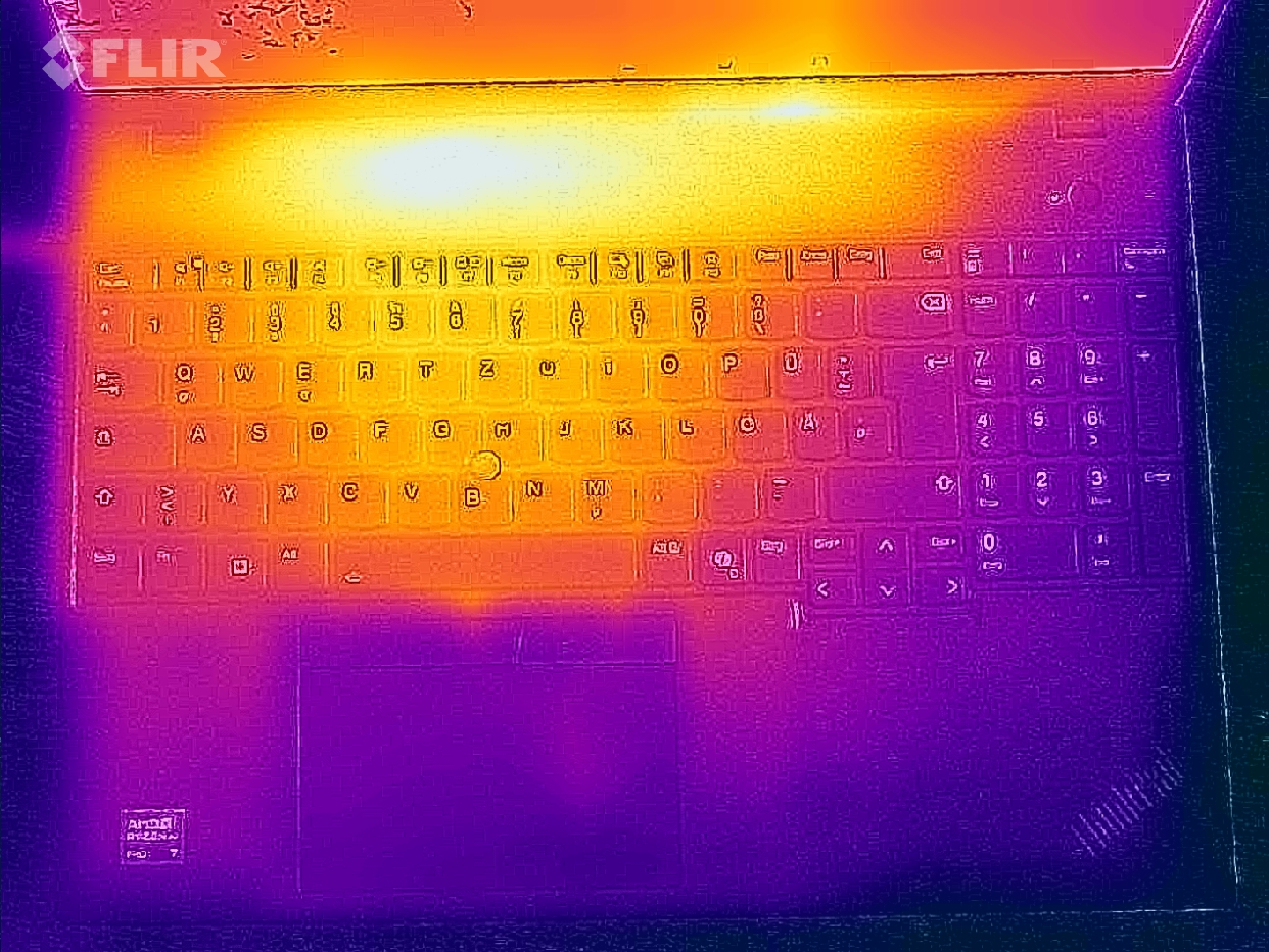 (+) Die Handballen und der Touchpad-Bereich sind mit gemessenen 26.8 °C kühler als die typische Hauttemperatur und fühlen sich dadurch kühl an.