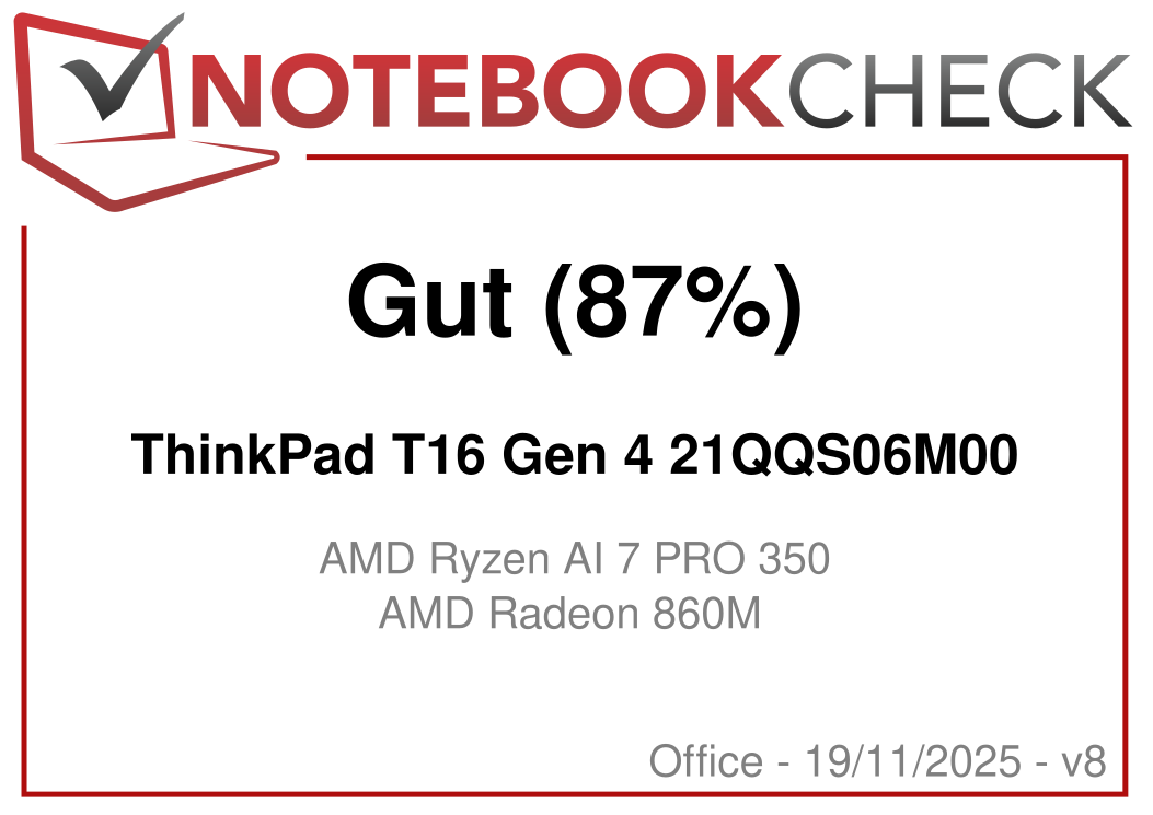 | Lenovo ThinkPad T16 Gen 4 21QQS06M00 AMD Ryzen AI 7 PRO 350 ⎘ AMD Radeon 860M ⎘ 32 GB RAM, 1024 GB SSD | Amazon: Bestpreis 1762€ notebookstore 2. 1767€ MetaComp 3. 1770€ TechnikDeals24 | 2 kg | 18.1 mm | 16.00" 1920x1200 142 PPI IPS | |