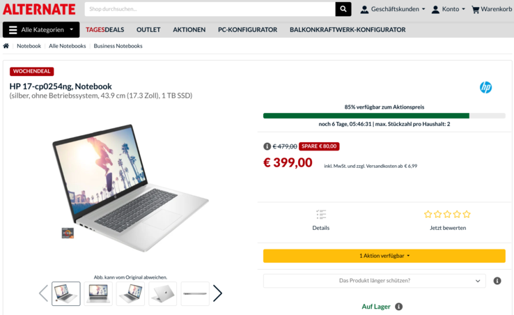 17-Zöller sind in der Regel teurer als kleinere Notebooks, weshalb das 19,9 mm dünne und mit 2,07 kg nicht zu schwere HP 17 zum genannten Deal-Preis schon als Schnäppchen anzusehen ist. Die Stückzahl ist jedoch begrenzt, zusätzlich zu einer zeitlichen Begrenzung bis zum 31.05.2024.