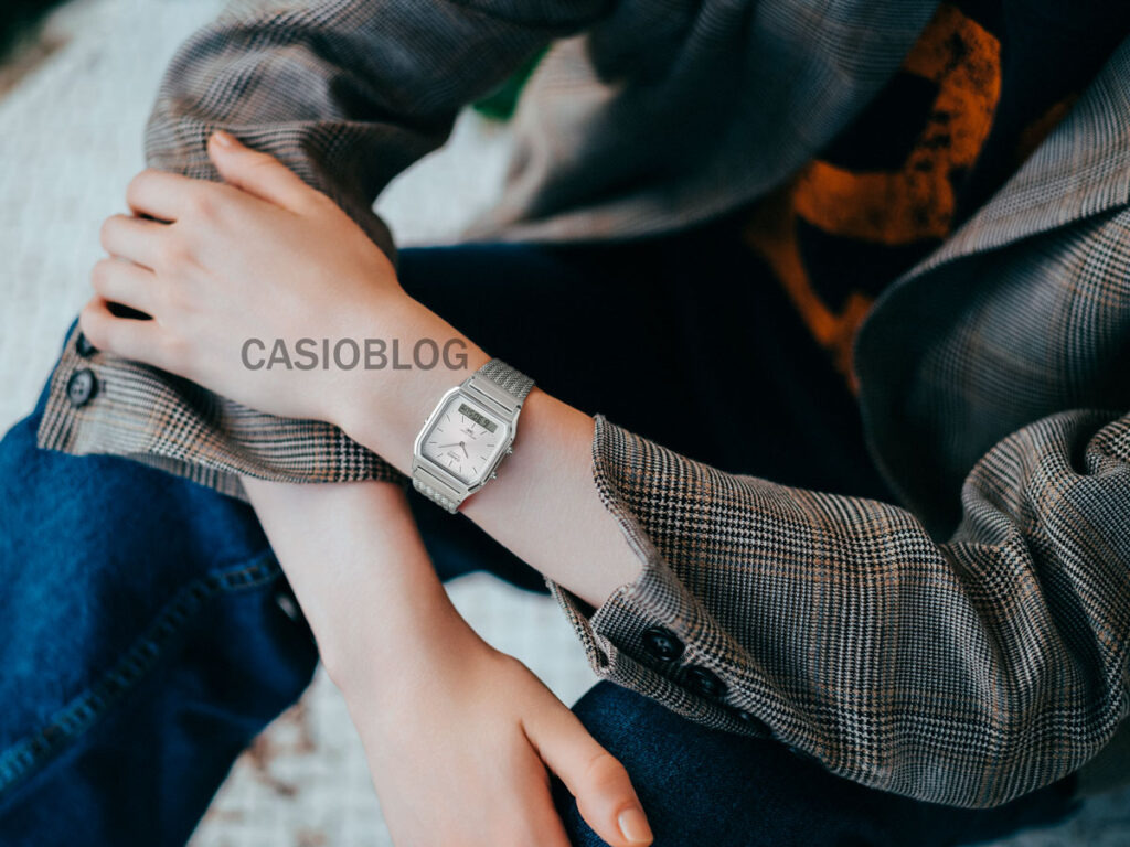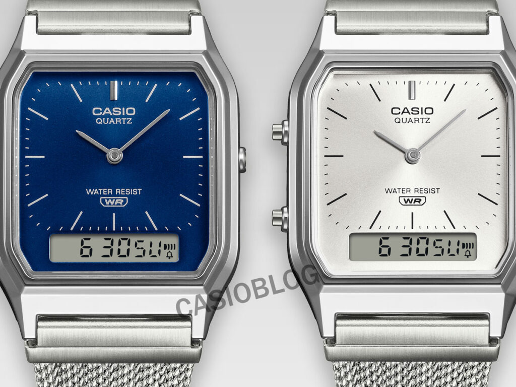 Das Zifferblatt der AQ-230 ist mit eleganten analogen Zeigern und schmalen Stundenmarkierungen ausgestattet und wird durch ein erweitertes digitales Anzeigefenster ergänzt, das für zusätzlichen „Vintage“-Charme sorgt. Das Design dieses Modells geht auf die AQ-500 („Janus“) aus dem Jahr 1982 zurück. Sie war für ihr Zifferblatt mit Metalleffekt berühmt. Die beiden neuen Mesh-Editionen verfügen über Kunststoffgehäuse und -lünetten mit Chromfinish sowie über ein Kunststoffglas. Aus diesem Grund sind sie vergleichsweise erschwinglich.