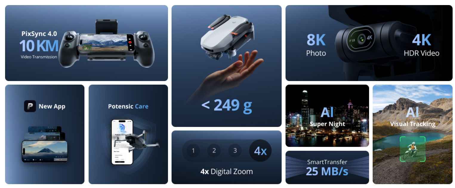 Als maximale Flugzeit gibt Ptensic 32 Minuten an, wobei sich dieser Wert dann aber nur in einer windstillen Umgebung erreichen lassen soll. Gesteuert werden muss nicht die ganze Zeit manuell: So wird das Abfliegen von Routen über GPS ebenso unterstützt wie das Tracking von Personen, womit sich auch alleine ansprechende Aufnahmen anfertigen lassen sollen. Videos sollen sich über PixSync 4.0 über bis zu 10 Kilometer übertragen lassen. Die Drohne ist bereits beim Hersteller erhältlich, für das Standard-Kit wird ein Preis von 330 Dollar aufgerufen, der Versand soll in einem Monat erfolgen. Eine Alternative könnte etwa die auch hierzulande über Amazon erhältliche Potensic Atom SE sein.