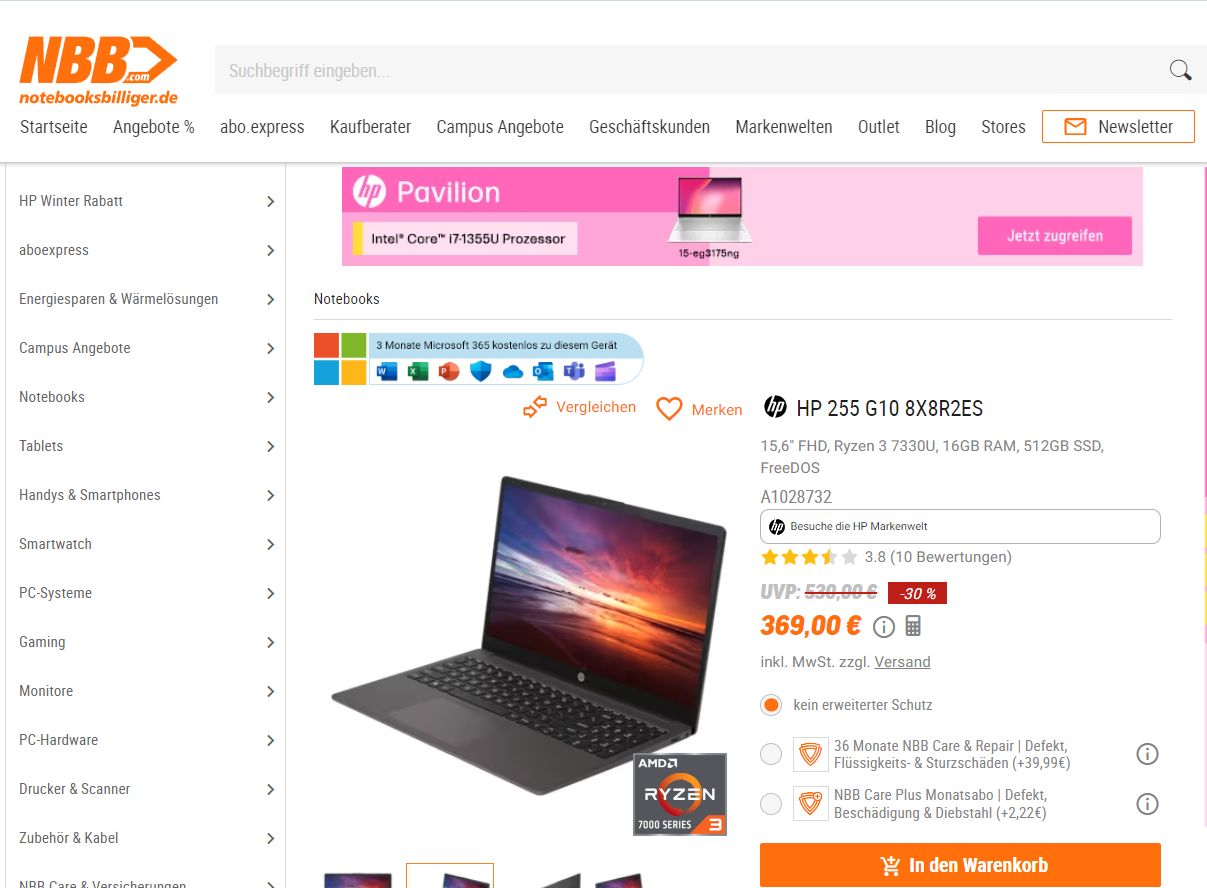 Ein günstiges 15,6-Zoll-Notebook mit erweiterbaren 16 GB RAM und effizientem AMD-Ryzen-7000 gibts aktuell mit dem HP 255 G10 zum Deal-Preis von nur 369 Euro bei Notebooksbilliger. Die Sechskern-CPU Ryzen 5 7530U kostet 60 Euro Aufpreis, während die günstigere Konfiguration mit dem Vierkerner Ryzen 3 7330U kommt.
