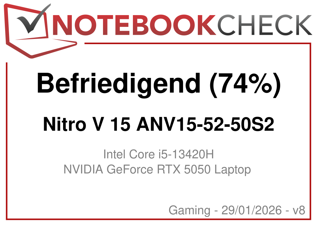 | Acer Nitro V 15 ANV15-52-50S2 Intel Core i5-13420H ⎘ NVIDIA GeForce RTX 5050 Laptop ⎘ 16 GB RAM, 1024 GB SSD | Amazon: Bestpreis 1079€ Cyberport-Shop 2. 1079€ computeruniverse.net 3. 1079€ Cyberport Stores Deutschland | 2.1 kg | 23.5 mm | 15.60" 1920x1080 141 PPI IPS | |