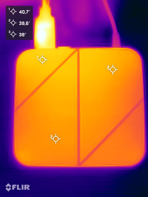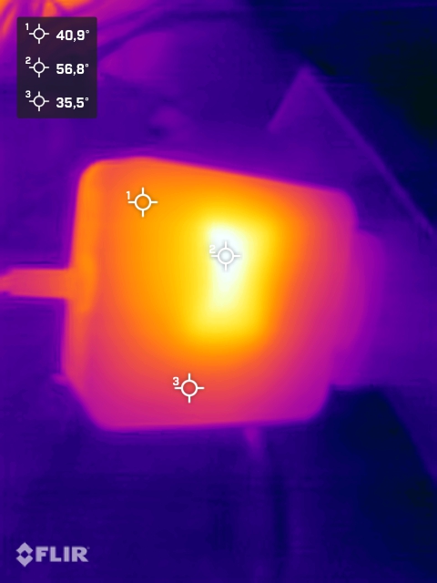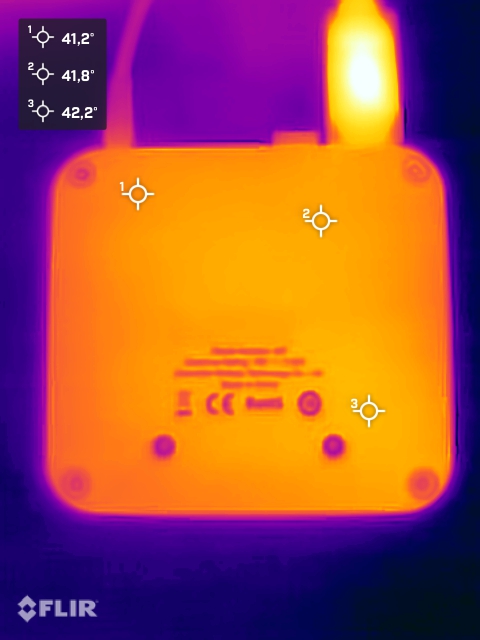 (±) Auf der Unterseite messen wir eine maximalen Wert von 44.3 °C (im Vergleich zum Durchschnitt von 36.3 °C).