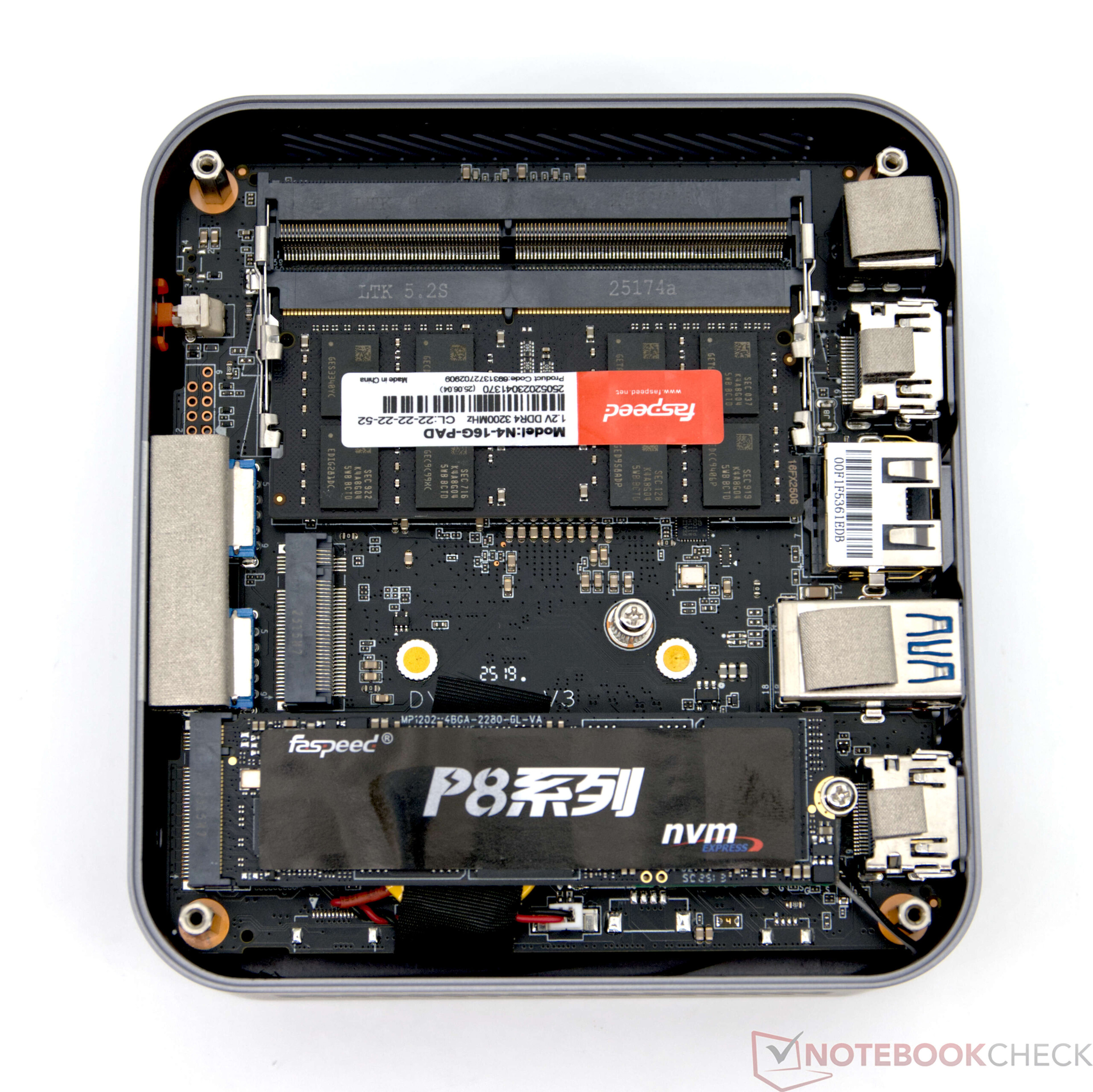 Der Ninkear M7 kommt in einem kompakten Gehäuse mit Abmessungen von 160 × 107 × 35,6 mm und einem Gewicht von rund 400 Gramm. Das vollständig aus Aluminium gefertigte Gehäuse verleiht dem Gerät sowohl optisch als auch haptisch einen hochwertigen Eindruck. Die Anschlüsse sind auf Vorder- und Rückseite verteilt und bieten die gängigen Schnittstellen für Office- und Multimedia-Anwendungen. Zudem unterstützt der Mini-PC den parallelen Betrieb von bis zu drei Monitoren. Abgerundet wird die Ausstattung durch 2,5-Gigabit-LAN und WLAN, wodurch eine solide Basis für den alltäglichen Einsatz gegeben ist.