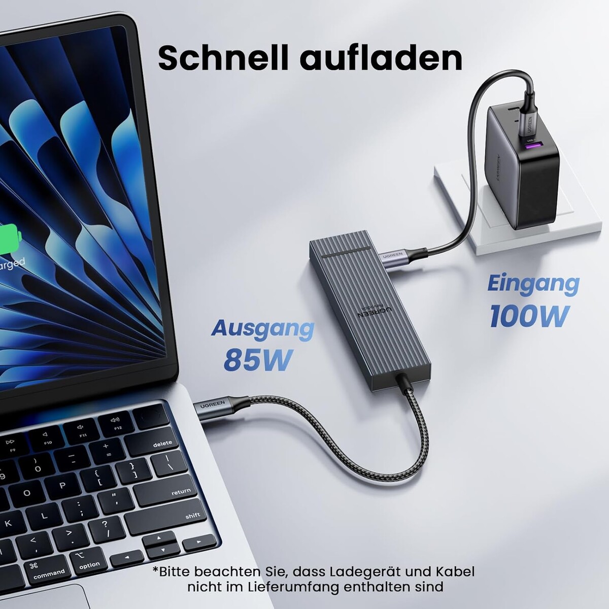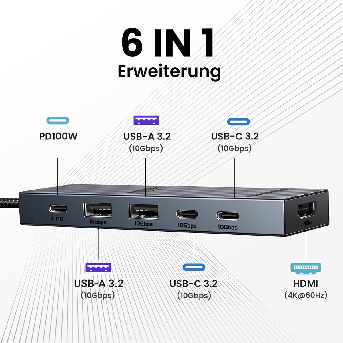 Insgesamt sechs Anschlüsse verbaut Ugreen in dem 6-in-1 Revodok 106 USB C Hub mit 10Gbps, der über das integrierte USB-C-Kabel mit dem Host verbunden wird und diesen so auch mit bis zu 85 W versorgen kann. Voraussetzung ist, dass der 100 W USB-C PD-Port mit einem entsprechenden Netzteil bzw. Ladegerät verbunden ist.