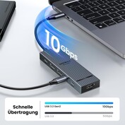 Dazu bietet der Ugreen Revodok 106 USB C Hub mit 10Gbps zwei weitere USB-C 3.2- sowie zwei USB-A 3.2-Anschlüsse für schnelle Datenübertragungen mit bis zu 10 Gbit/s. Für die Bildausgabe steht ein HDMI-Anschluss, der bis zu 4K mit 60 Hz unterstützt, an der Stirnseite des kompakten Hubs zur Verfügung.