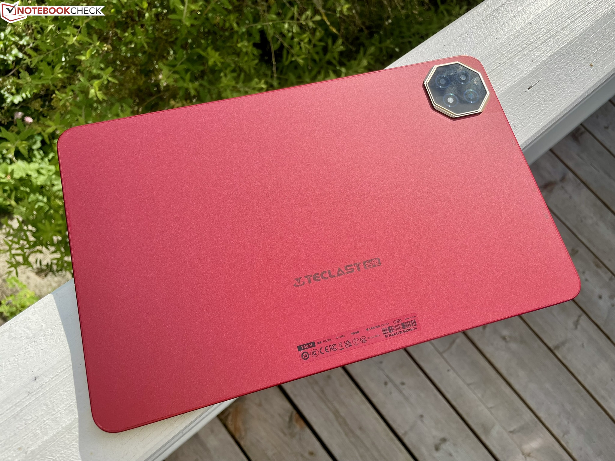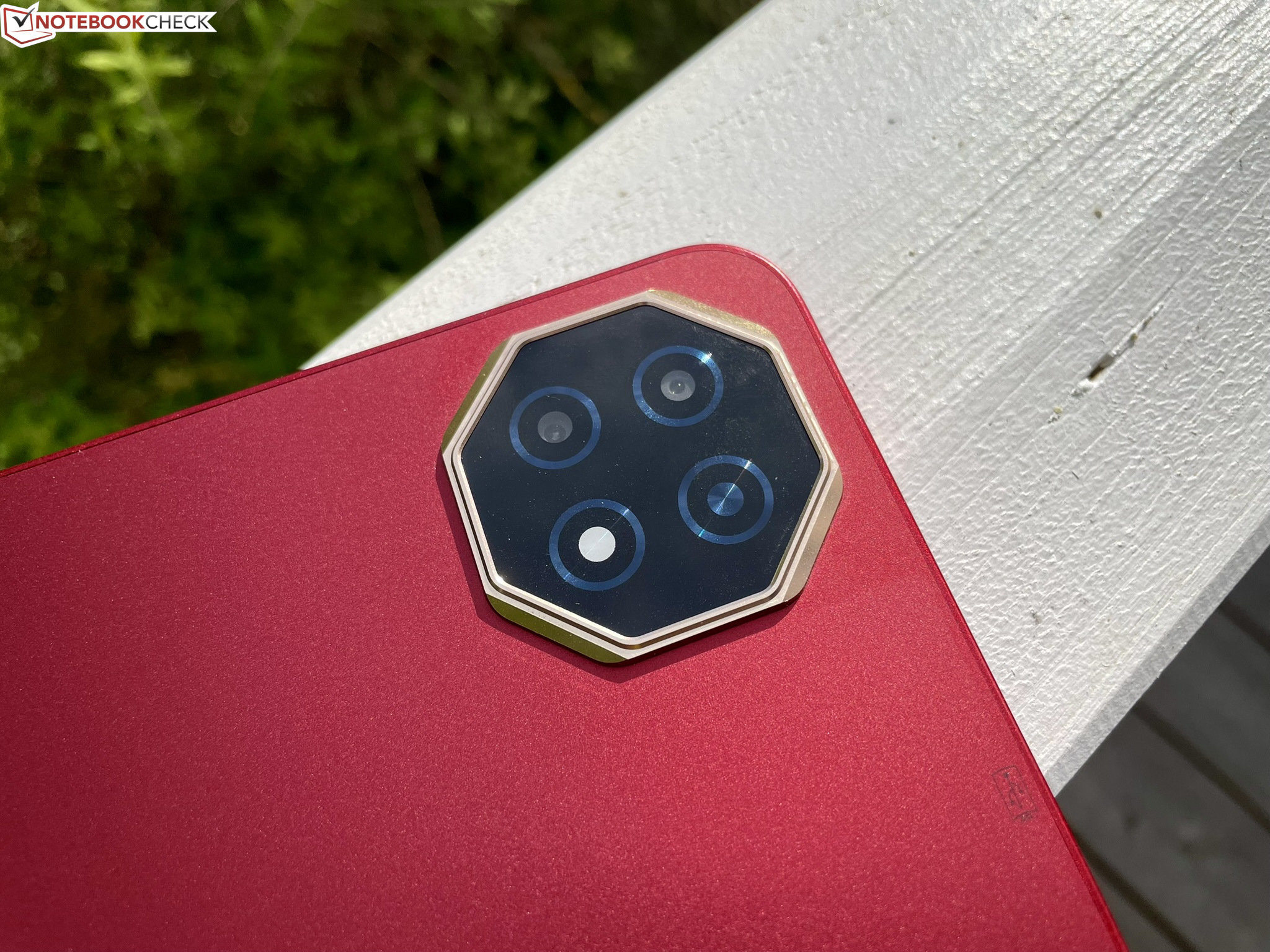 Teclast verpackt das T60 AI in ein Metallgehäuse, das mit seinem burgunderroten Farbton und der Oktagon-förmigen und goldfarben Kameraeinfassung auf der Rückseite die Blicke auf sich zieht.