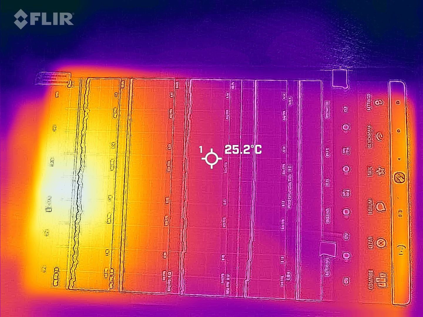 (+) Auf der Unterseite messen wir eine maximalen Wert von 34.6 °C (im Vergleich zum Durchschnitt von 33.2 °C).
