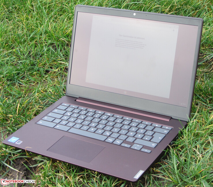 Lenovo hat mit dem Chromebook S340-14T ein günstiges Chromebook im Sortiment, das in zwei unterschiedlichen Farben zu haben ist: Onyx Black und Dark Orchid. Bei Letzterem handelt es sich um ein dunkles Weinrot - die Farbe des uns zur Verfügung gestellten Testgeräts.