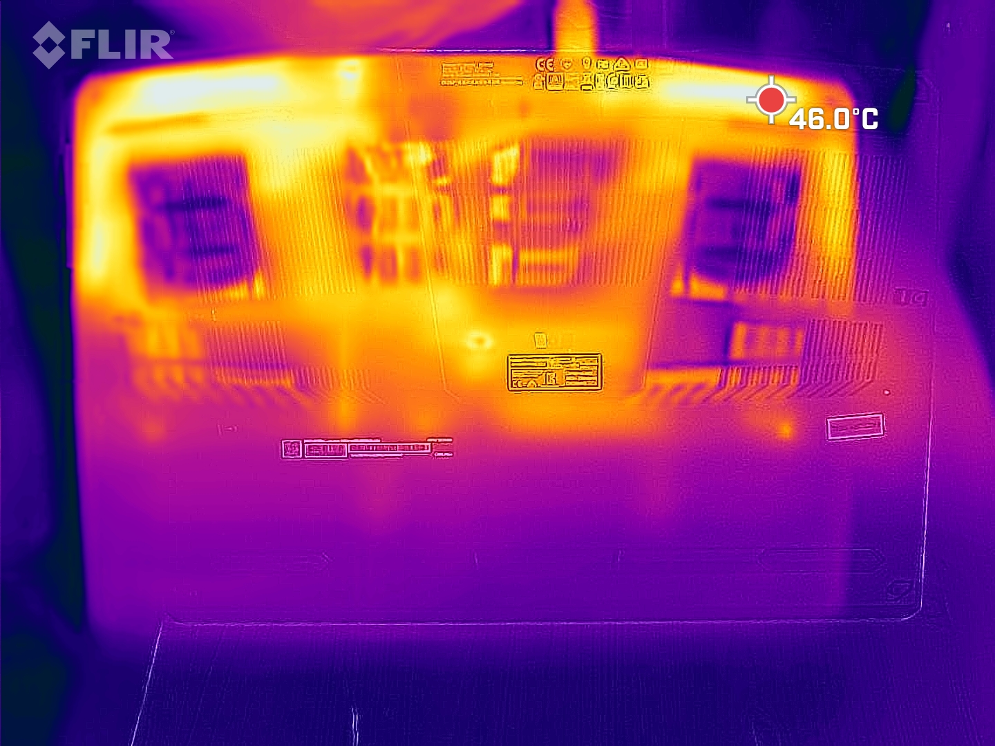 Beim Spielen erreichen Hot Spots an der Ober- und Unterseite bis zu 54 °C, womit sich der Gamer mittig in die Konkurrenz einreiht. Das Alienware sowie das Aorus werden heißer, während das Asus und das XMG kühler bleiben, dafür aber das lautere Kühlsystem mit sich bringen.