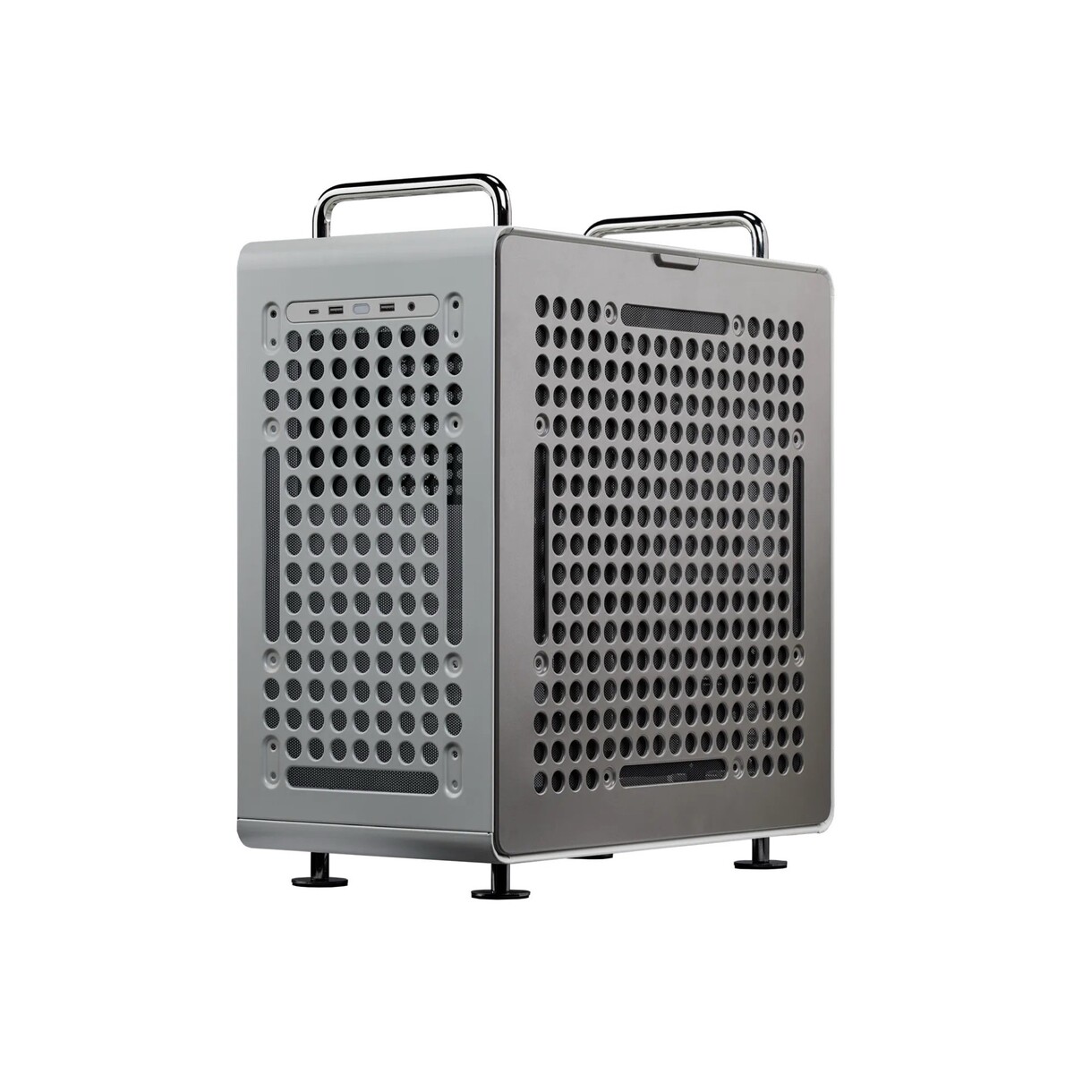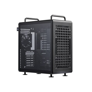Das neue Cooler Master QUBE 540 soll trotz relativ günstigem Preis besonders vielseitig sein. Das beginnt schon bei den Maßen von 42,5 x 42,5 x 22,5 Zentimetern, die es erlauben, ITX- bis E-ATX-Mainboards sowie maximal 41,5 Zentimeter lange Grafikkarten zu verwenden. An der Vorder- und Rückseite sowie au der rechten Seite befinden sich große, kreisförmige Öffnungen, die es erlauben, Zubehör am Gehäuse zu befestigen.