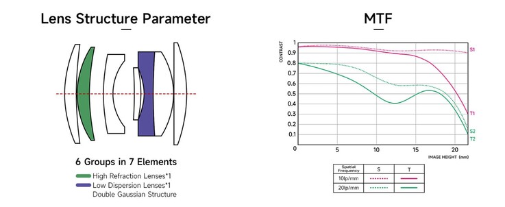Um den geringen Preis zu ermöglichen, setzt Brightin Star auf eine relativ einfache Objektiv-Konstruktion mit sieben Linsen in sechs Gruppen, und verzichtet gänzlich auf apshärische oder apochromatisch korrigierte Linsen. Wie die MTF-Kurven des Herstellers deutlich machen, bildet das Objektiv bei Offenblende an den Bildrändern nur sehr wenige Details ab, scharf ist das Objektiv nur in der Mitte des Bilds, wodurch sich dieses unter anderem für Porträts eignen dürfte.