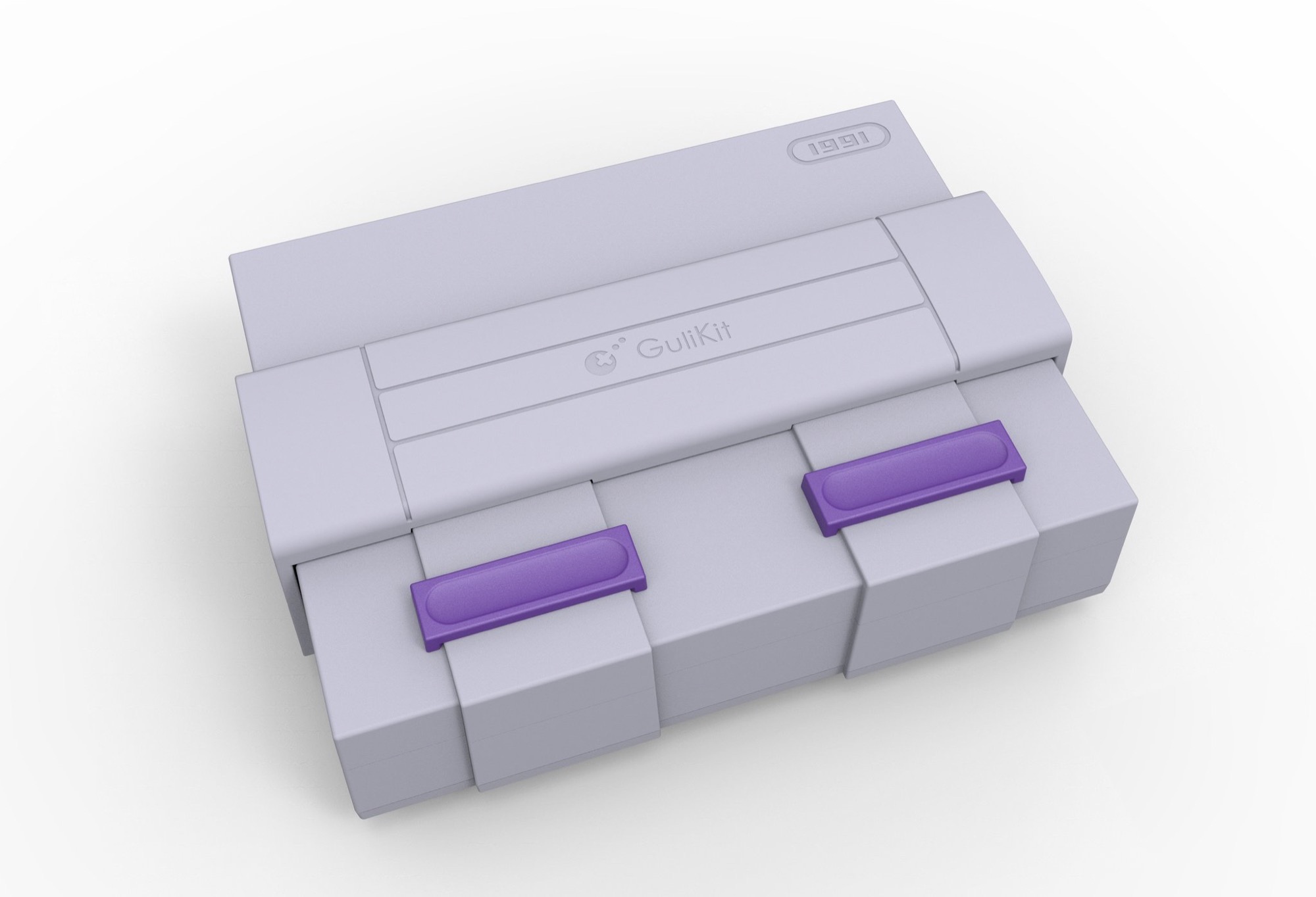 Die Besonderheit dieses Docks: In Verbindung mit der mitgelieferten Staub-Abdeckung erinnert das Gehäuse stark an die US-amerikanische Version des Super Nintendo, vom hellgrauen Gehäuse über die violetten Farbakzente bis hin zum eingeprägten "1991" – ein Hinweis auf das Jahr, in dem Ninendos SNES in den USA auf den Markt gekommen ist.