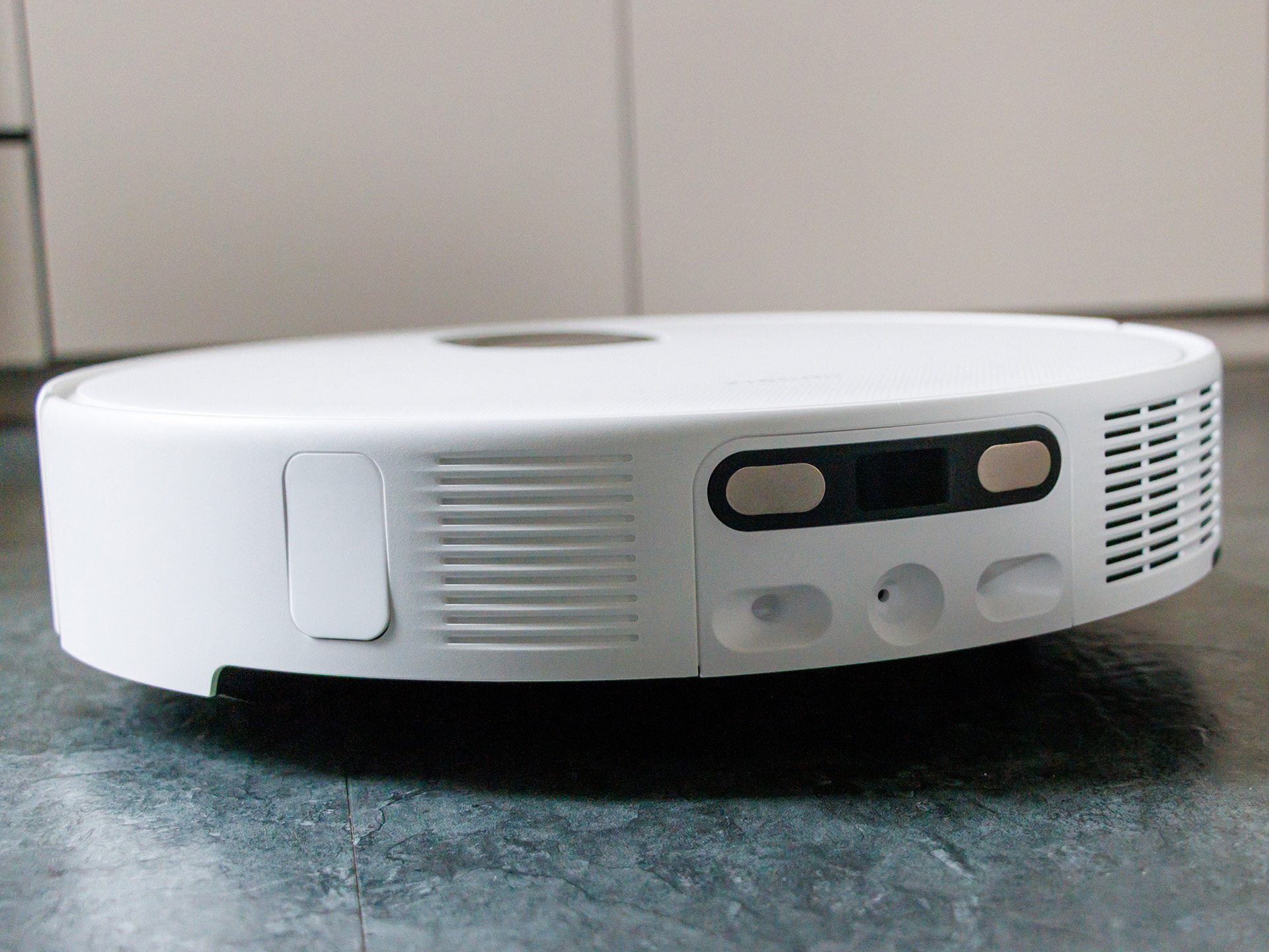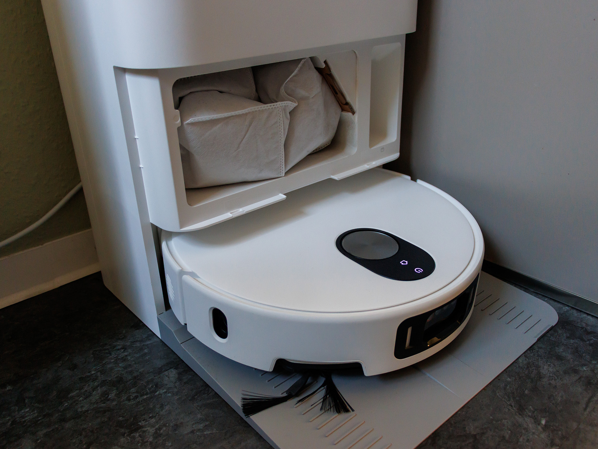 Vorne arbeitet ein KI-Triple-Kamera-Setup aus RGB- und Infrarotkameras plus 3D-Infrarot-Punktprojektor, das mehr als 200 Objekte in Echtzeit erkennen soll. Das funktioniert im Alltag auch meistens zuverlässig, lediglich kleinere Legosteine werden gerne mal übersehen und auch ein 1-Cent-Stück landete im Staubbeutel. Unter dem Sofa hatte der Saugroboter im Test zudem Probleme ein Kabel zu erkennen.