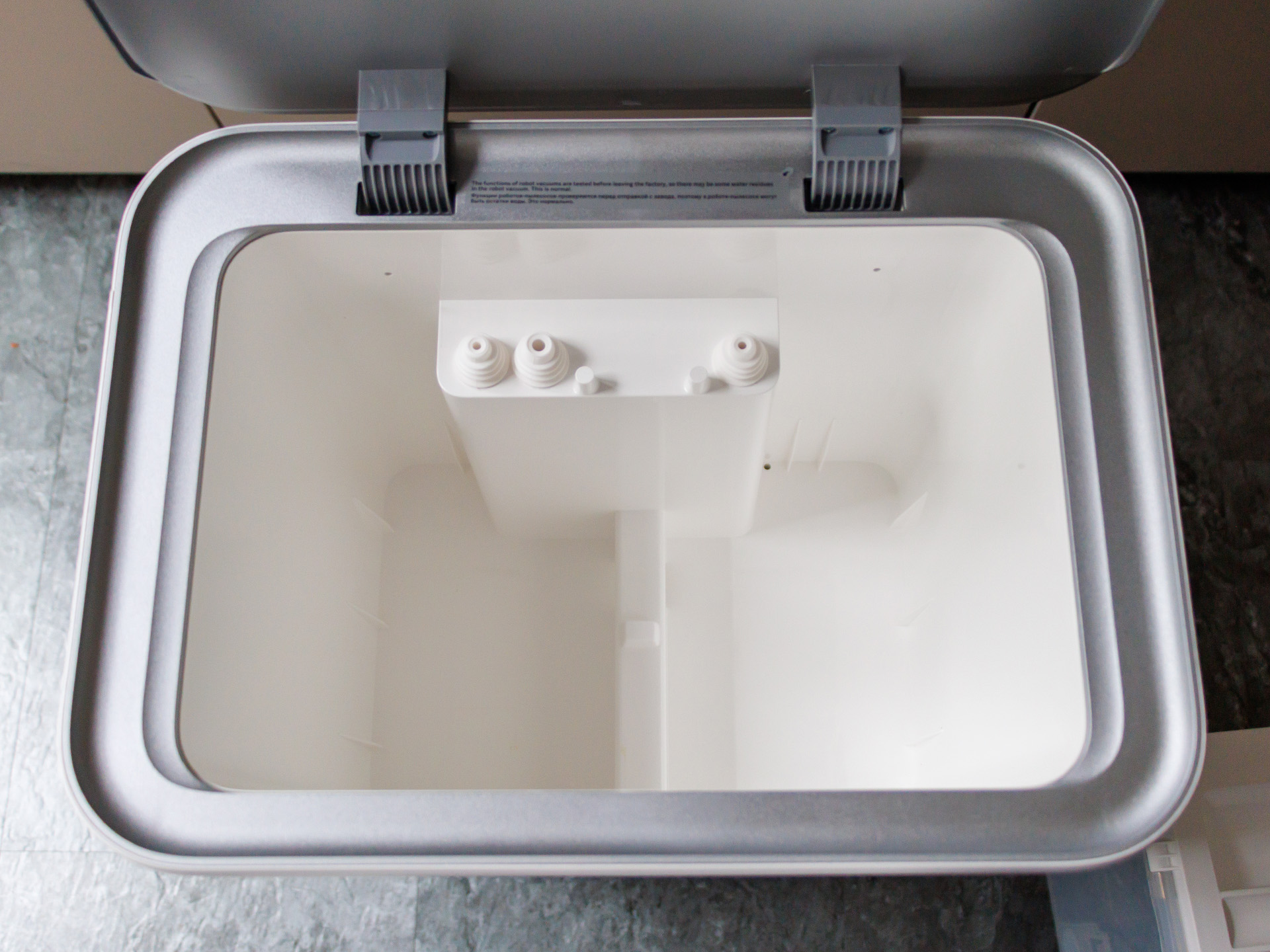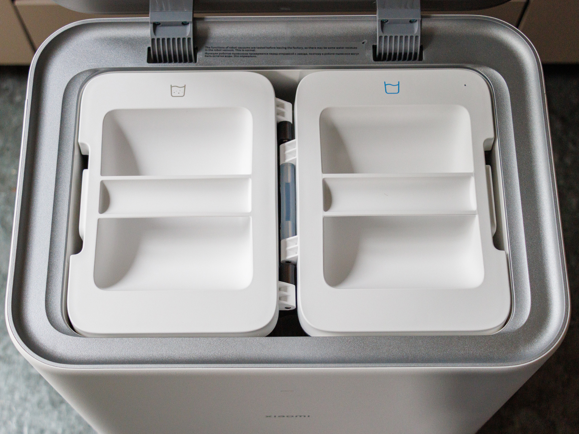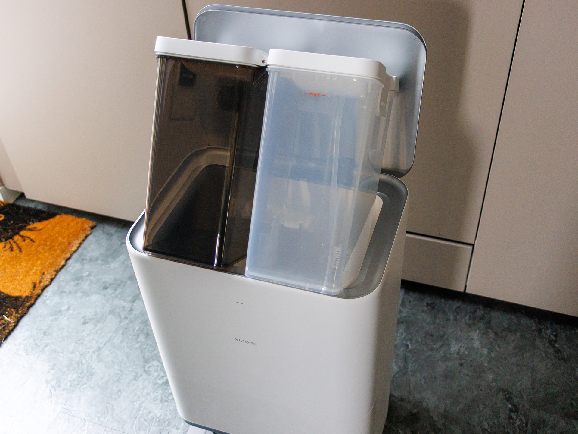 Der Staubbehälter ist recht klein, sodass auf großen Reinigungsflächen der Saug-Wischroboter die Station öfter zum Leeren ansteuern muss. Dort können auch die Mopps vollautomatisch mit 80 °C heißem Wasser gereinigt werden. Leider bietet der Xiaomi Robot Vacuum 5 Pro keinen Reinigungsmittelbehälter, sondern wischt feucht mit klarem Wasser. Ab Werk haben die genutzte Wassermenge als recht gering empfunden, weshalb wir den größten Teil des Tests mit Stufe 3 haben wischen lassen. Ein voller Wassertank in der Station hat dann für etwas mehr als 240 qm² gereicht.
