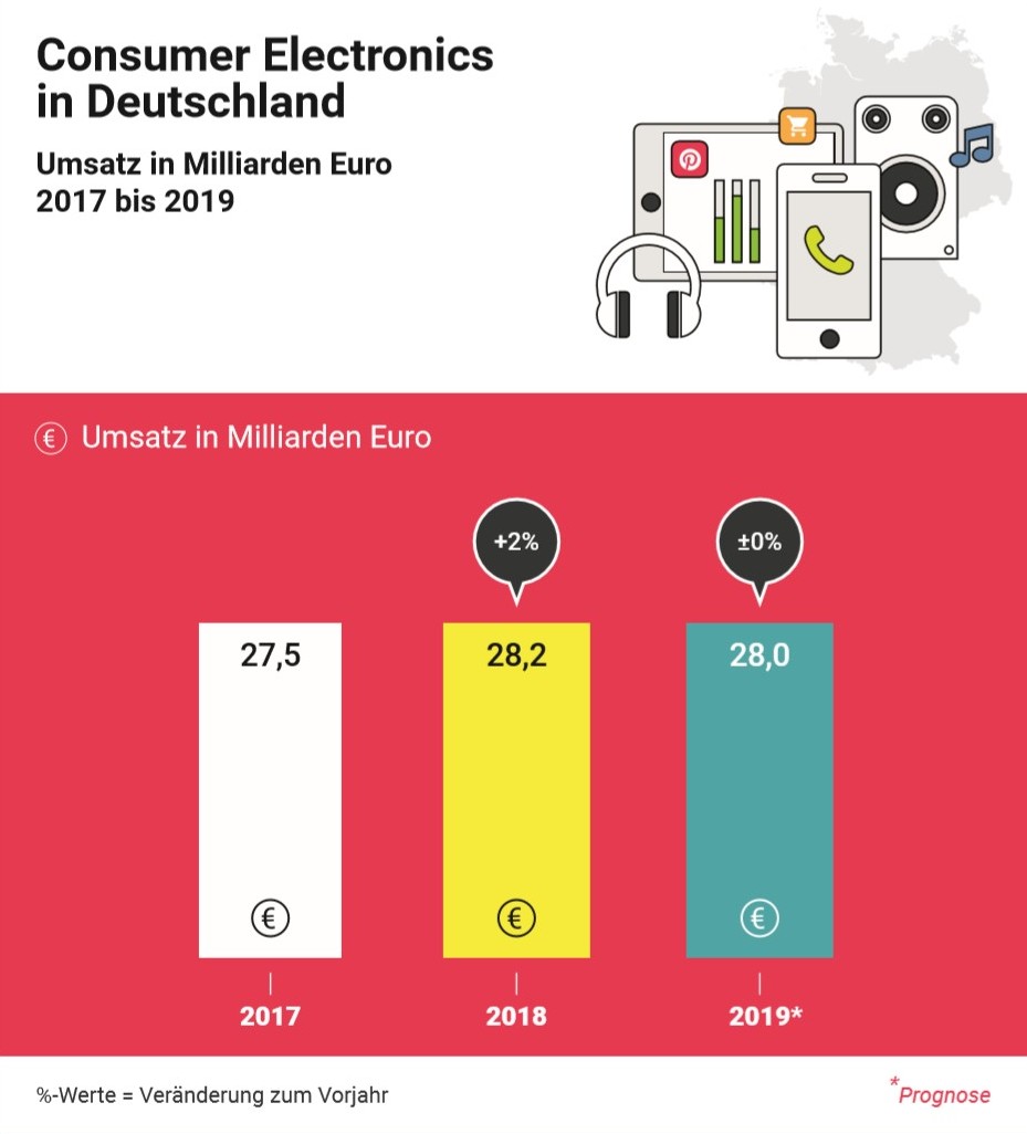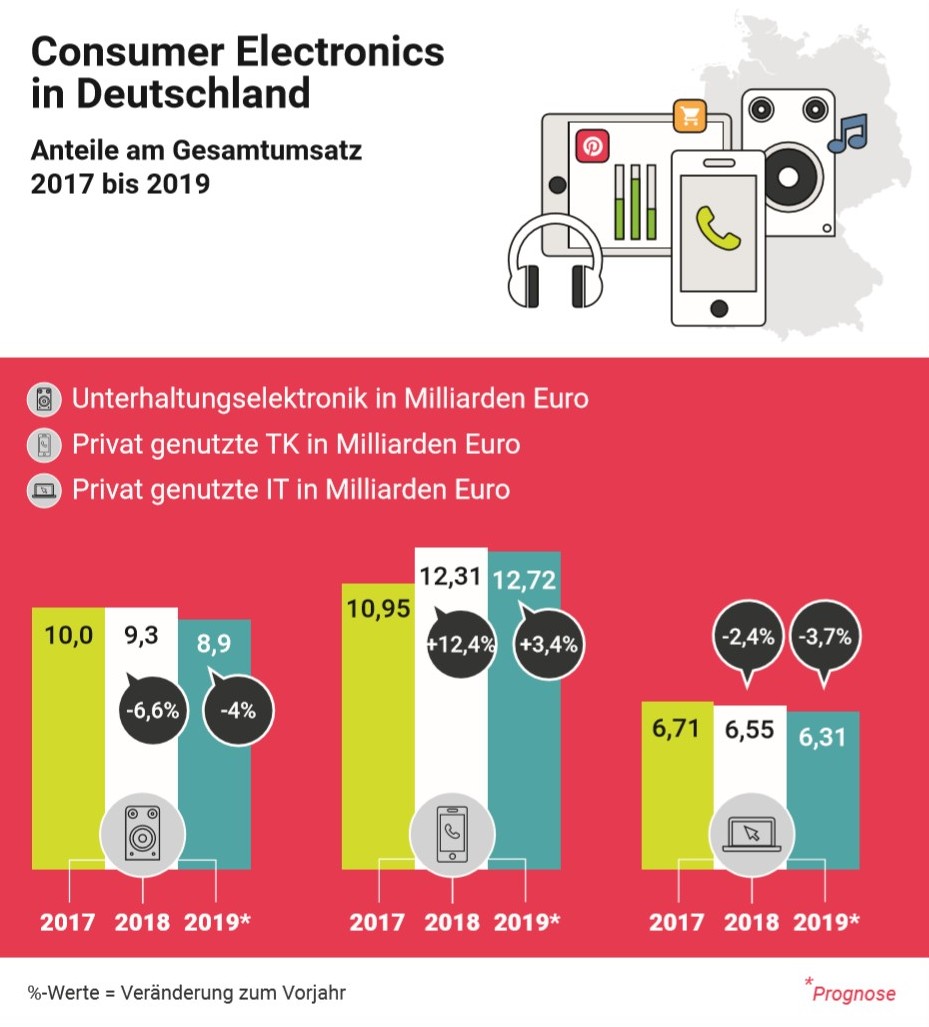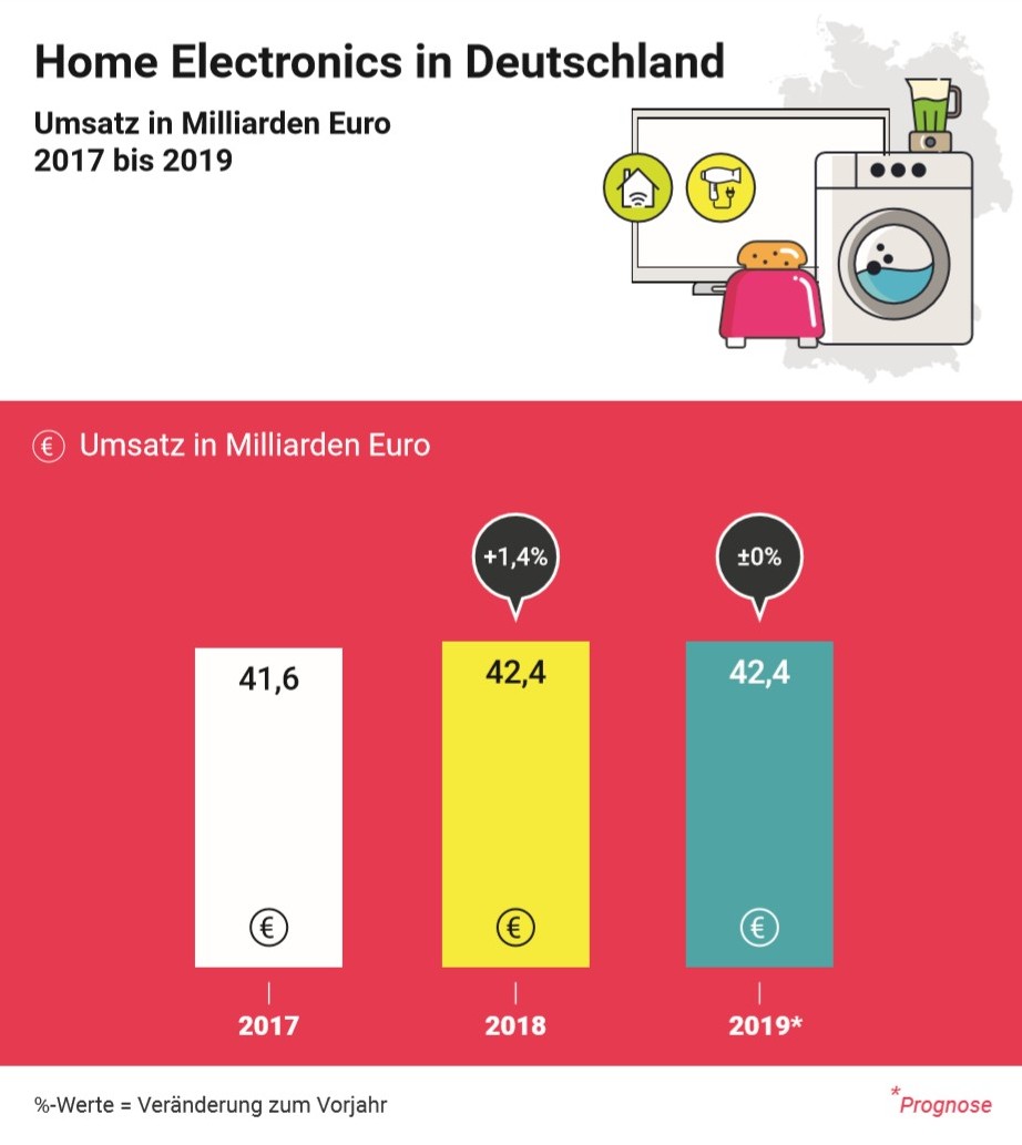 Im Bereich der klassischen Unterhaltungselektronik ist für 2018 hingegen ein Rückgang gegenüber dem Vorjahr um 6,6 Prozent auf knapp 9,3 Milliarden Euro zu verzeichnen. Mit einem Minus von 2,4 Prozent auf knapp 6,6 Milliarden Euro fiel der Umsatzverlust im Segment der privat genutzten IT-Produkte erneut geringer aus als im Vorjahr. Elektro-Hausgeräte verzeichneten einen stabilen Umsatz von 14,2 Milliarden Euro. Elektro-Großgeräte verloren erstmals seit mehr als zehn Jahren mit einem Minus von 1,6 Prozent auf 8,7 Milliarden Euro. Die Elektro-Kleingeräte gewannen 2018 mit einem Plus von 3,2 Prozent auf knapp 5,5 Milliarden Euro hinzu.