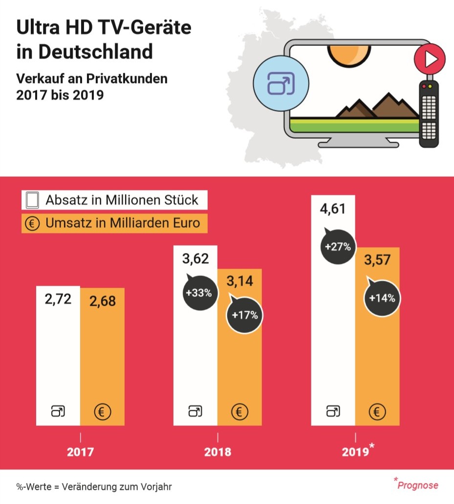 Für das Jahr 2019 rechnen gfu, GfK und der BVT mit einer stabilen Entwicklung für den Home Electronics-Markt mit einem Umsatz auf Vorjahresniveau. Großformatige TV-Geräte und das Audio-Segment dürften sich positiv entwickeln, der private Markt für Smartphones wird sein Wachstum auch 2019 fortsetzen können. Für den Bereich der privat genutzten IT-Geräte wird allerdings ein leichter Rückgang erwartet.
