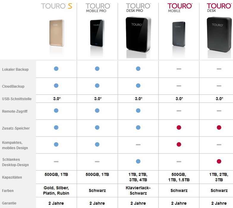Die externe HDD-Serie kommt im schlanken Design und Aluminium-Gehäuse in den Metallicfarben Gold, Silber, Platin und Rubinrot daher. Zu dem lokalen HDD-Speicher erhält jeder Touro-S-Kunde gratis zusätzlich 3 GByte Speicherplatz in der Touro Cloud Backup. Die Cloud bietet die Möglichkeit, Fotos, Videos, Musik und Dokumente online zu speichern. Dort sind diese nicht nur geschützt, sondern auch immer abrufbar.