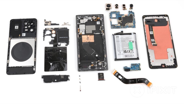 Statt auf Klebstoff setzt HMD Global beim Display auf eine Schaumstoff-Dichtung, um die IP54-Zertifizierung zu ermöglichen. Der Akku ist zwar ins Gehäuse geklebt, lässt sich dank Plastik-Lasche aber einfach entfernen. Auch die Lautsprecher, der USB-C-Port, der microSD- und SIM-Kartenleser und alle vier Kameras lassen sich jeweils einzeln und relativ einfach tauschen. Original-Ersatzteile sollen in Kürze im iFixit-Onlineshop vertrieben werden.