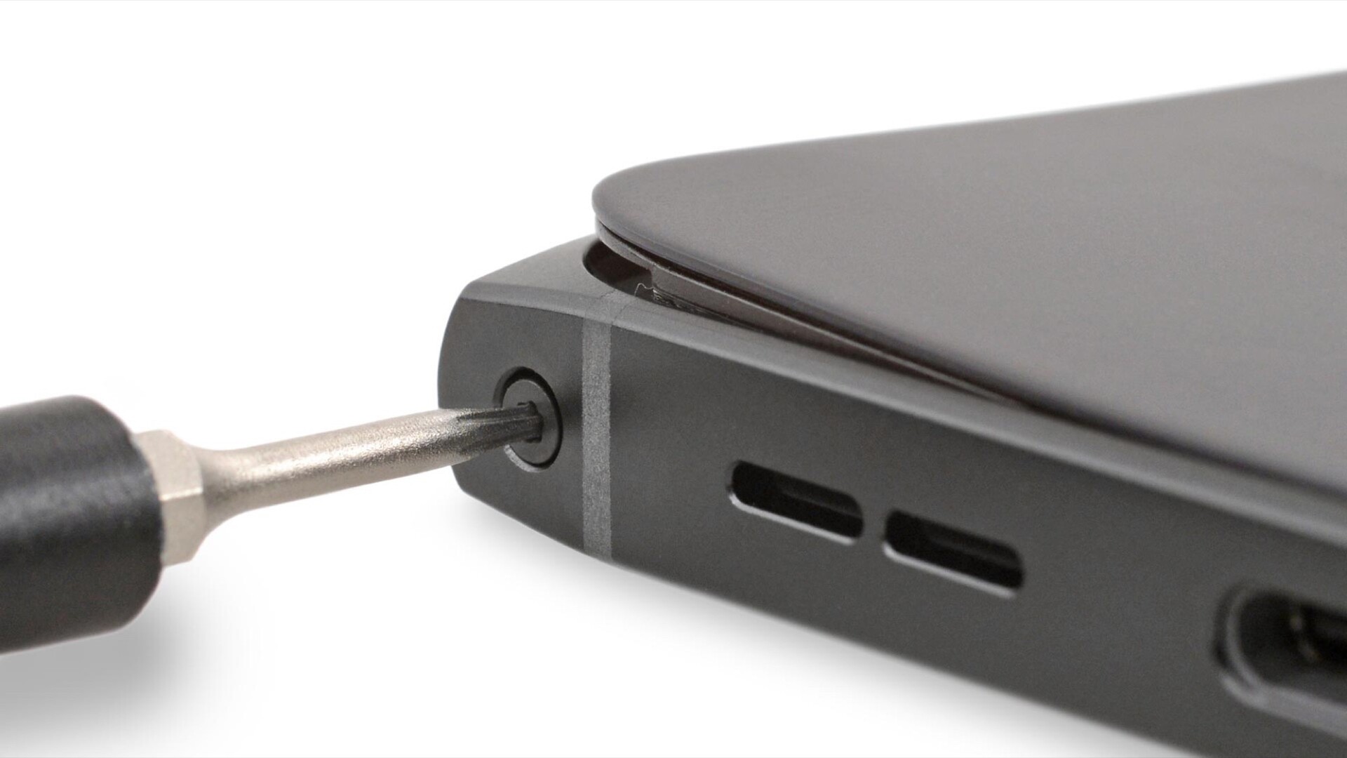 Die Schraube betätigt einen Mechanismus, der die entsprechende Ecke der Rückseite aus dem Gehäuse stößt, sodass Nutzer problemlos ein Werkzeug einführen können, um den Klebstoff zu lösen. Ganz ohne Klebstoff kommt das Gerät nicht aus, denn dieser schützt das Gehäuse vor dem Eindringen von Wasser, der verwendete Kleber lässt sich aber vergleichsweise einfach entfernen.
