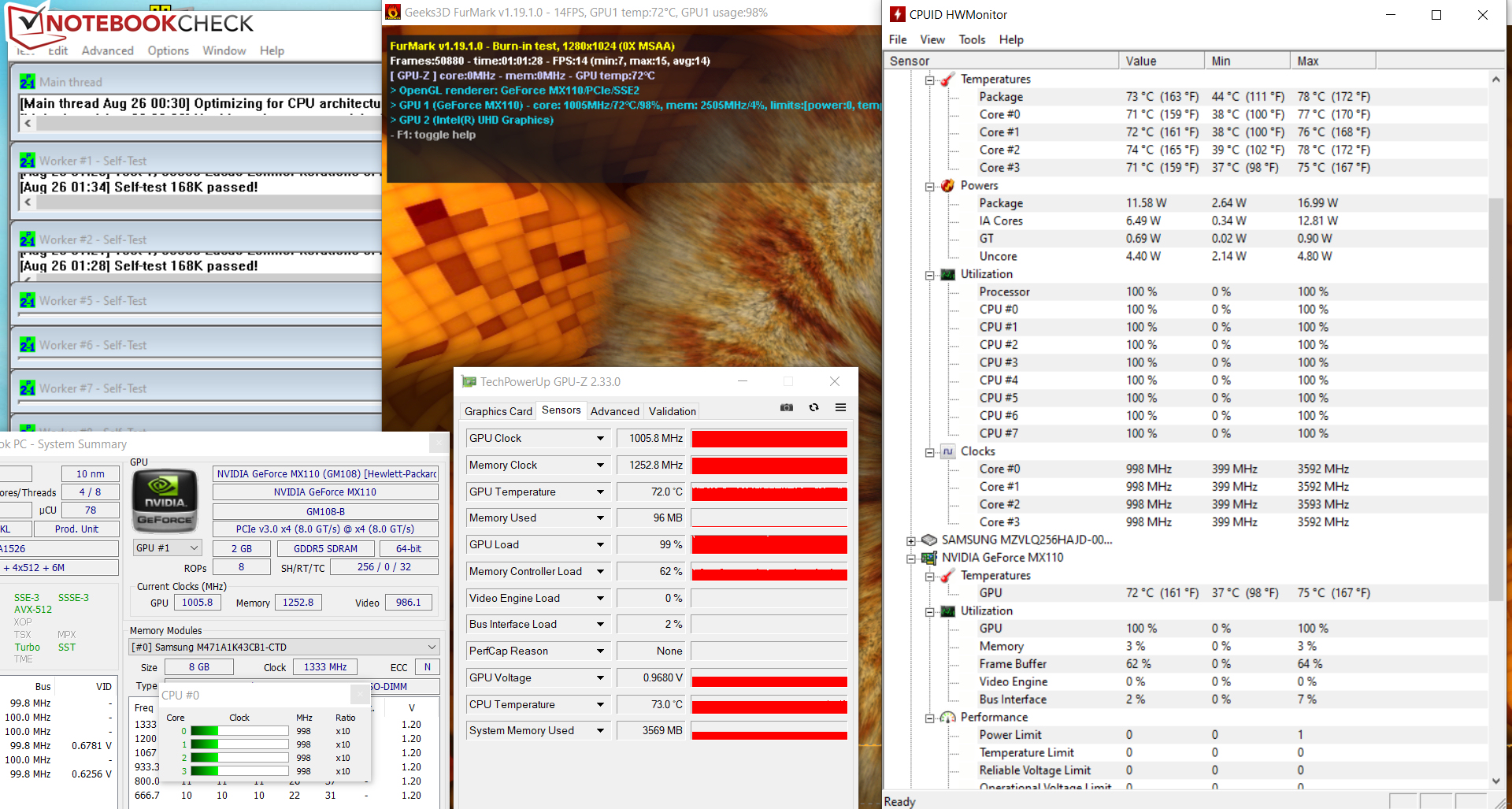 Unseren Stresstest (Prime95 und Furmark laufen für mindestens eine Stunde) durchläuft die CPU kurzzeitig mit 1,8 bis 2,2 GHz. Dann sinkt der Takt auf 1 GHz (Netzbetrieb) bzw. 500 bis 600 MHz (Akkubetrieb) und verbleibt auf diesem Niveau. Der Grafikkern geht mit 1.006 MHz zu Werke. Der Stresstest stellt ein Extremszenario dar, welches so im Alltag nicht auftritt. Wir überprüfen mit diesem Test, ob das System auch bei voller Auslastung stabil läuft.