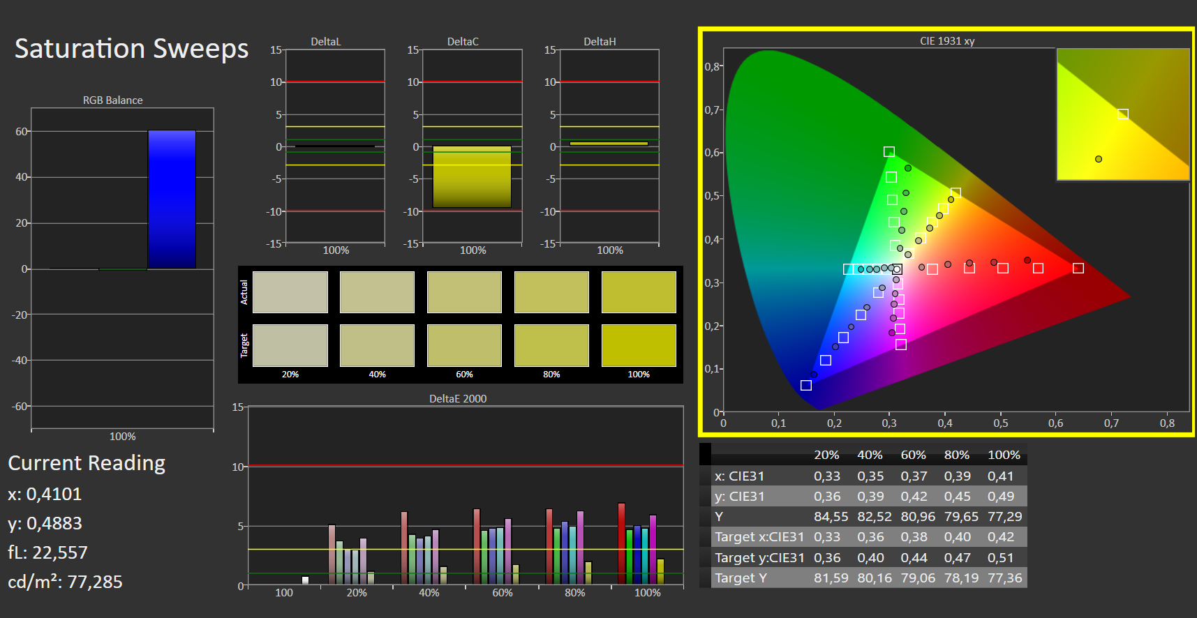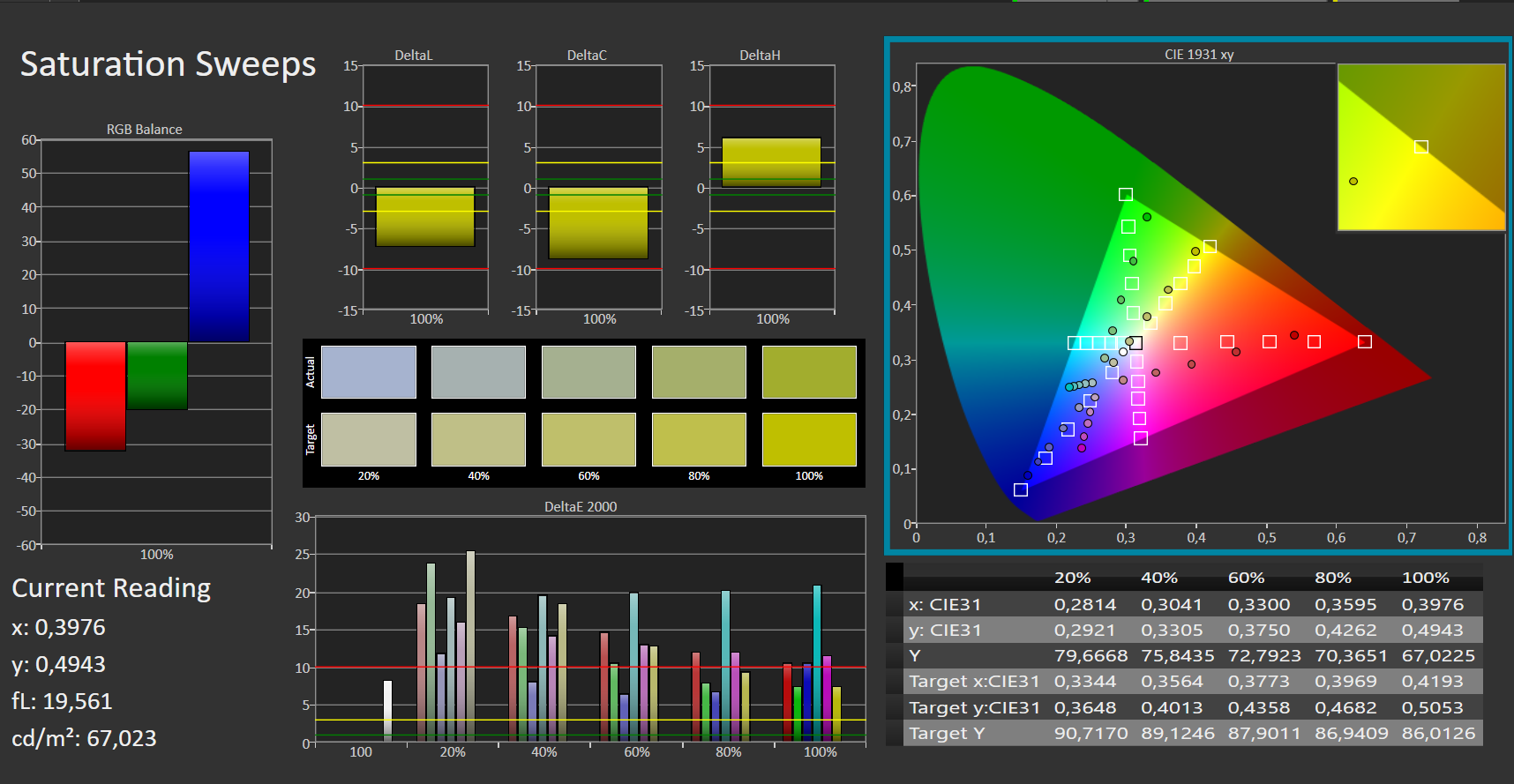 Die Farbdarstellung im Auslieferungszustand löst keine Begeisterung aus. Mit einer Delta-E-2000-Farbabweichung von knapp 13 wird das Soll (Delta-E kleiner 3) klar verfehlt. Darüber hinaus leidet das Display unter einem deutlichen Blaustich. Mittels einer Kalibrierung ist eine sichtbare Verbesserung zu erreichen. So sinkt die Farbabweichung auf 4,4, der Blaustich verschwindet und die Graustufen werden deutlich ausgewogener dargestellt. Die Farbräume AdobeRGB (37 Prozent) und sRGB (58 Prozent) kann der Bildschirm nicht abbilden.