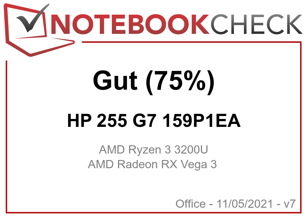 | 74.6 % v7 (old) | 05 / 2021 | HP 255 G7 159P1EA R3 3200U, Vega 3 | 1.8 kg | 22.5 mm | 15.60" | 1920x1080 | |