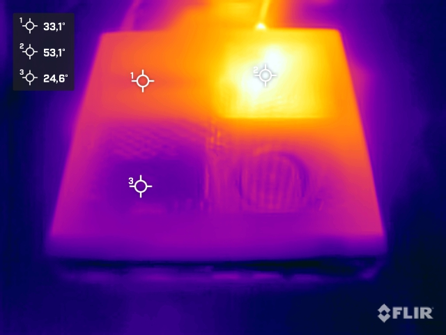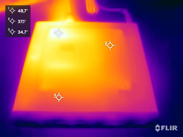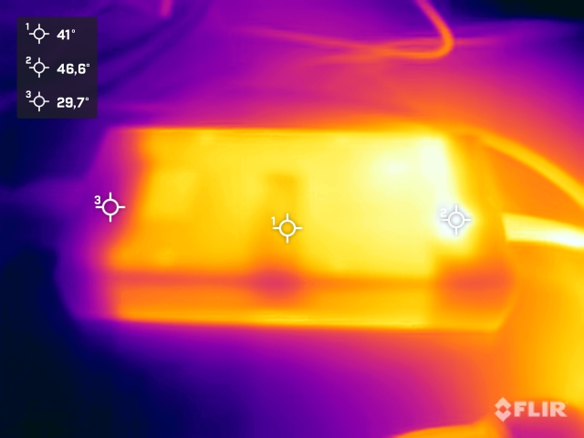 (-) Auf der Unterseite messen wir eine maximalen Wert von 45.4 °C (im Vergleich zum Durchschnitt von 36.4 °C).