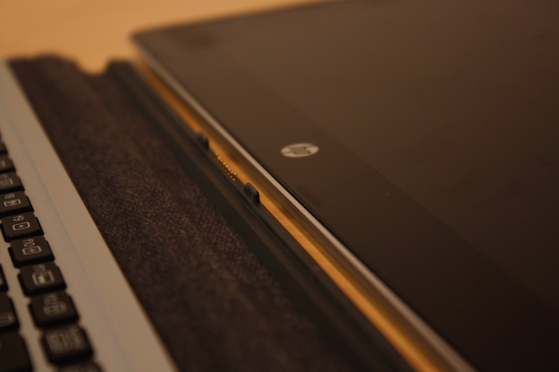 Was den Tastatur-Dock selbst betrifft, so geben sich die Aluminium-Basiseinheit und die Kunststoff-Tasten mit Hintergrundlicht wiederum fester als sie aussehen. Letztere verfügen über ein solides Feedback und einen Hubweg von 1,5 mm. Wie das Microsoft Type Cover wird die Basiseinheit mit dem Tablet durch magnetische Federkontaktstifte (POGO Pins) verbunden und bietet weder Bluetooth noch Unterstützung für einen sekundären Akku. Auf die Frage nach zusätzlicher Funktionalität der Basiseinheit, ähnlich wie beim Micosoft Surface Book, spekulierte Hartsfield lediglich mit möglichem kabellosen Laden bei kommenden HP Elite x2 Redesigns.