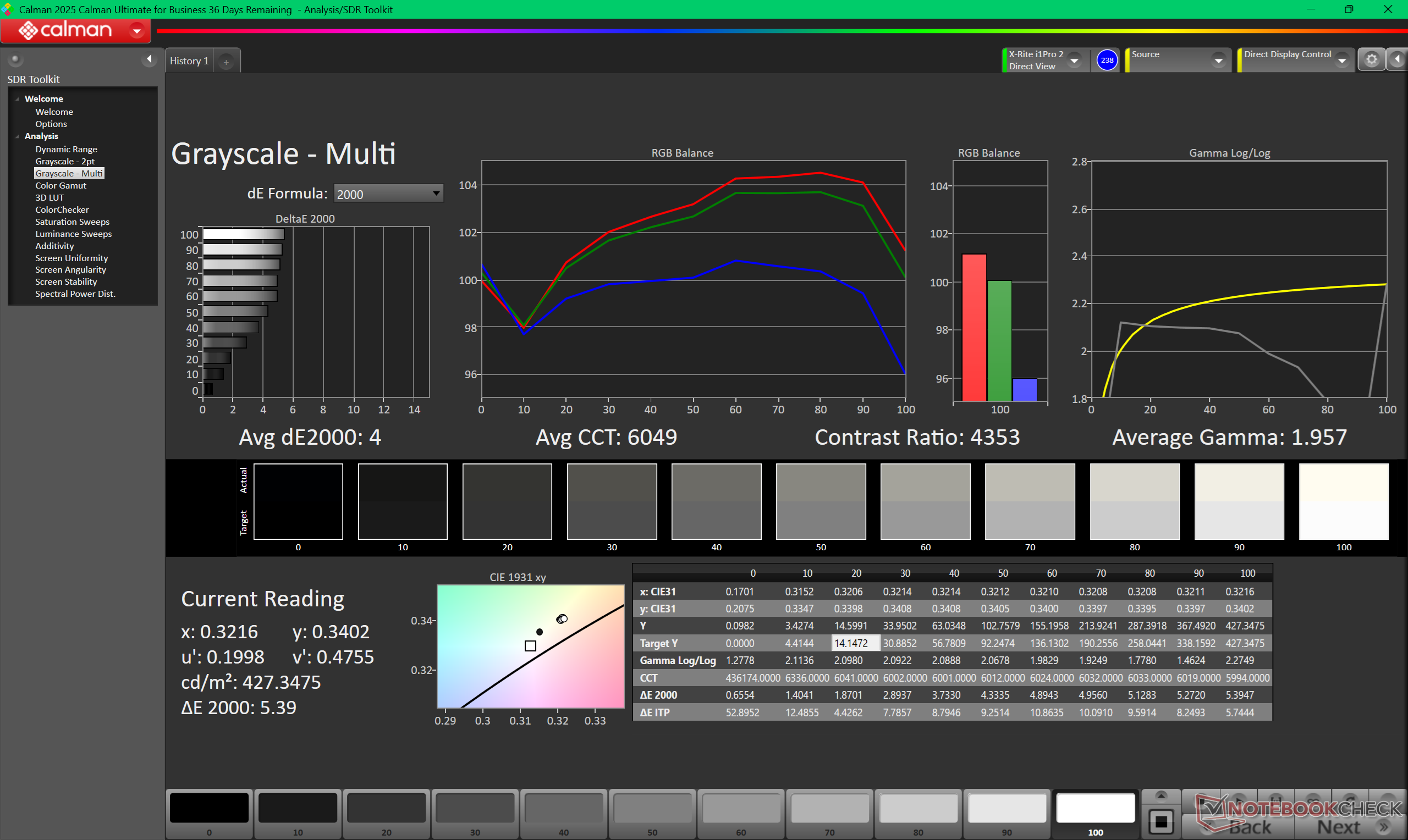 Das Panel ist ab Werk nur mäßig kalibriert mit seiner übermäßig warmen Farbtemperatur und relativ niedrigen durchschnittlichen DeltaE Graustufen- und Farbwerten von 4,0 bzw. 3,31. Das ist zwar nicht schlecht für ein günstiges Business-Notebook, aber eine Kalibrierung für den Endbenutzer kann sich schwieriger gestalten, da die X-Rite-Software derzeit nicht mit ARM Geräten kompatibel ist.