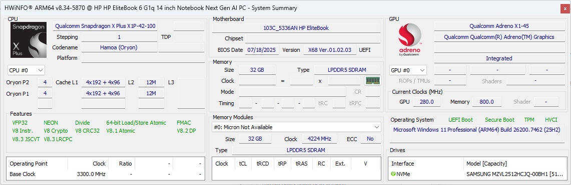 | HP EliteBook 6 G1q 14 Qualcomm Snapdragon X Plus X1P-42-100 ⎘ Qualcomm SD X Adreno X1-45 1.7 TFLOPS ⎘ 32 GB RAM, 512 GB SSD | Amazon: Bestpreis 799€ office-partner.de 2. 799€ OTTO Office 3. 799€ playox.de | 1.5 kg | 17 mm | 14.00" 1920x1200 162 PPI IPS | |