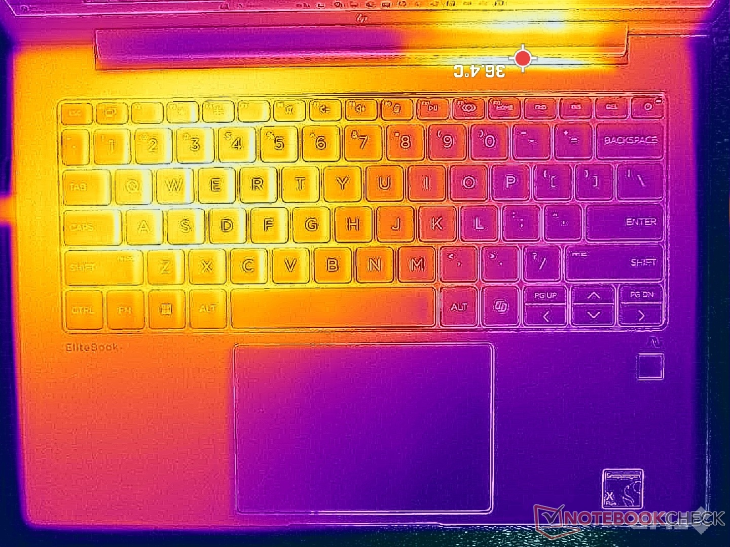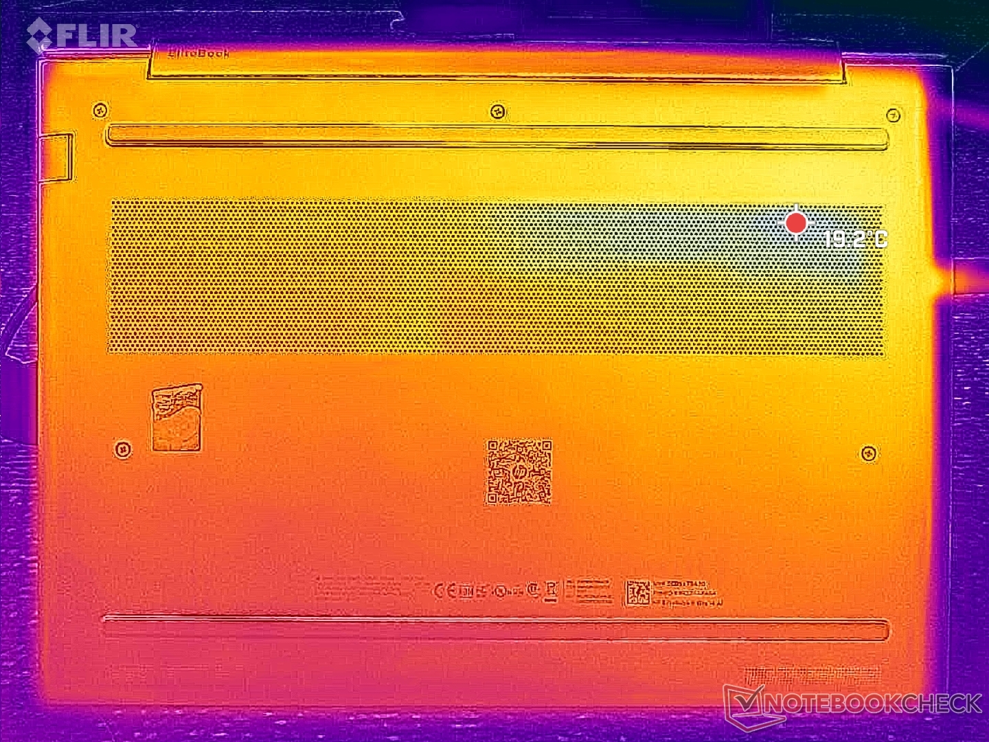 Die Oberflächentemperaturen sind auf der linken Hälfte des Gehäuses in der Nähe des Prozessors deutlich wärmer. Hot Spots können bis zu 40 °C erreichen, was nur geringfügig kühler ist als die Temperaturen, die wir auf dem Intel angetriebenen ThinkPad E14 Gen 7 erlebt haben.