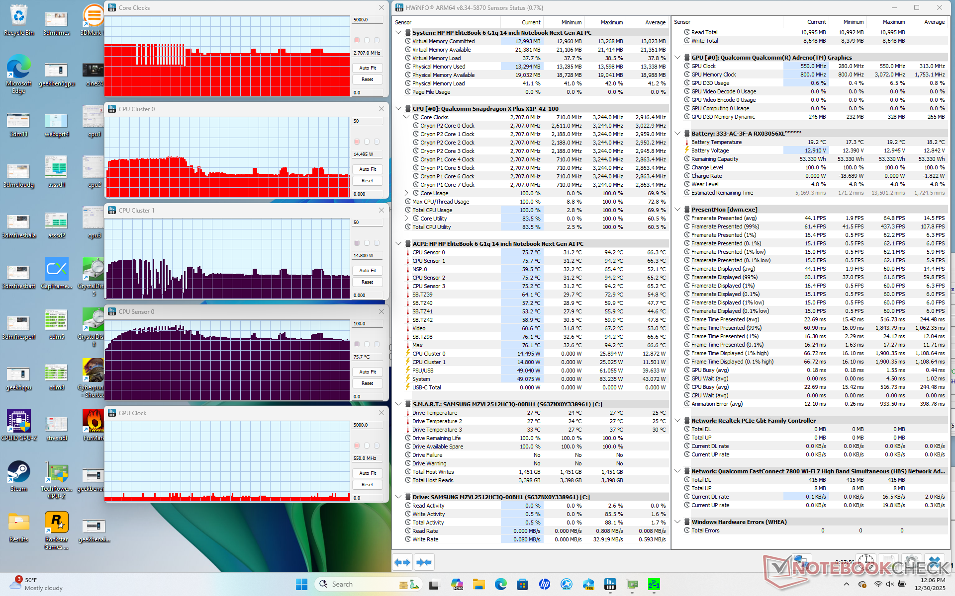 Das Snapdragon betriebene EliteBook ist erwartungsgemäß sehr effizient, vor allem bei alltäglichen Arbeitslasten wie Browsern oder Videos. Es kann anspruchsvoller sein als ein System mit Core Ultra 7 258V wie das ThinkPad T14 G6, wenn die CPU voll ausgelastet ist, aber es bietet gleichzeitig eine schnellere Leistung bei einem ähnlichen Leistungsverhältnis pro Watt.